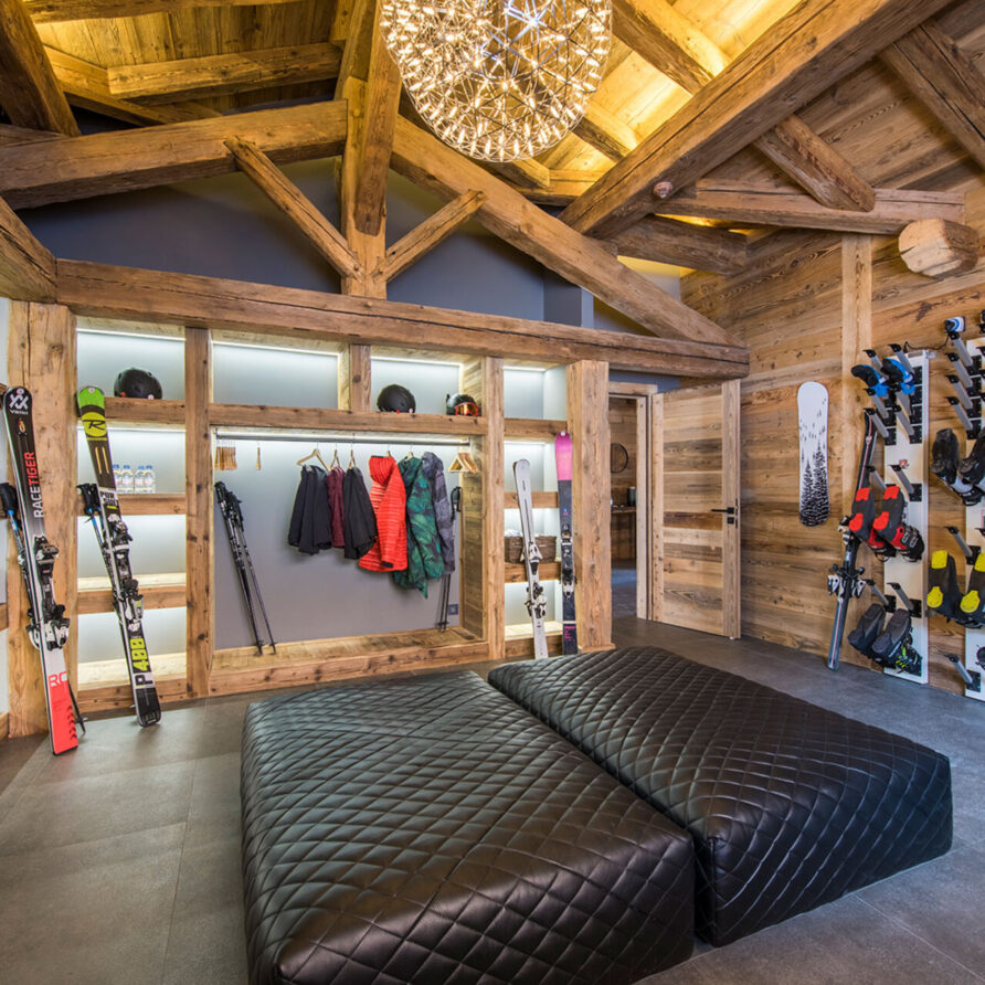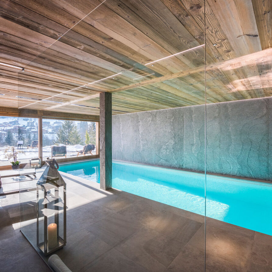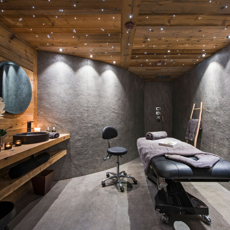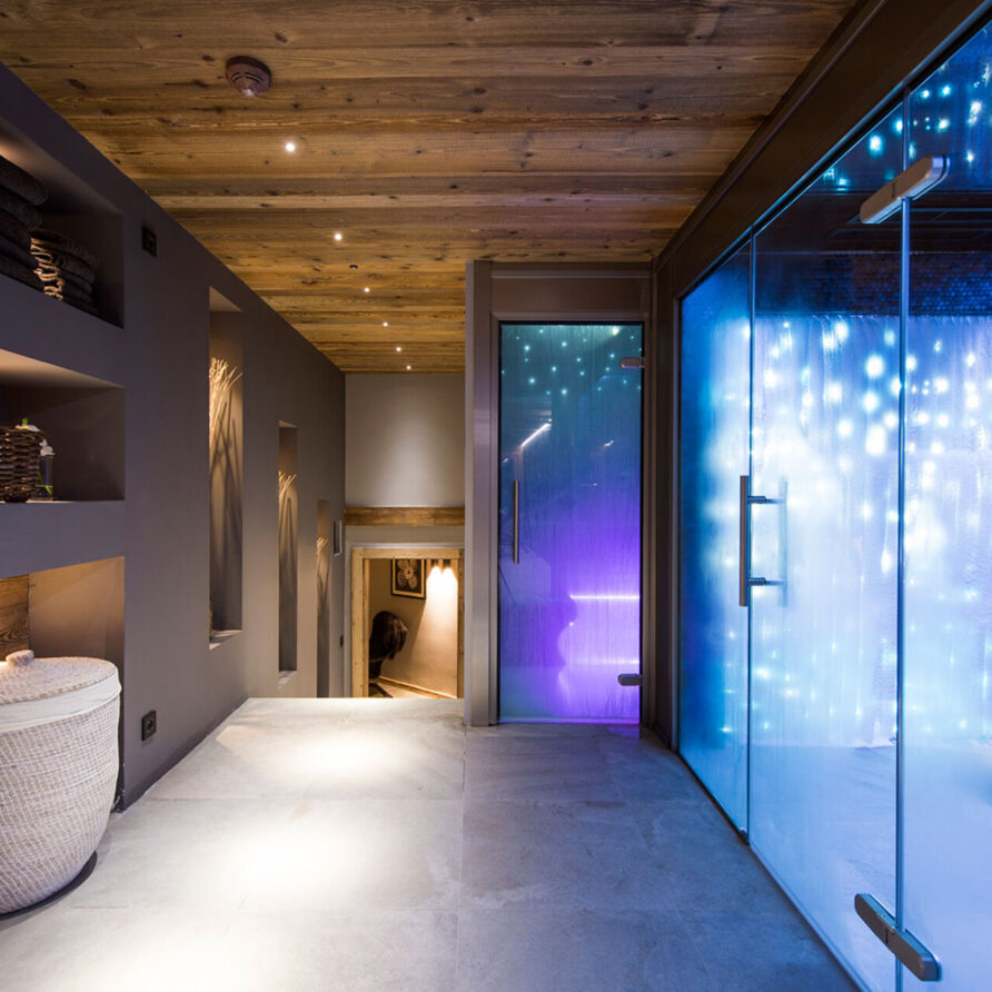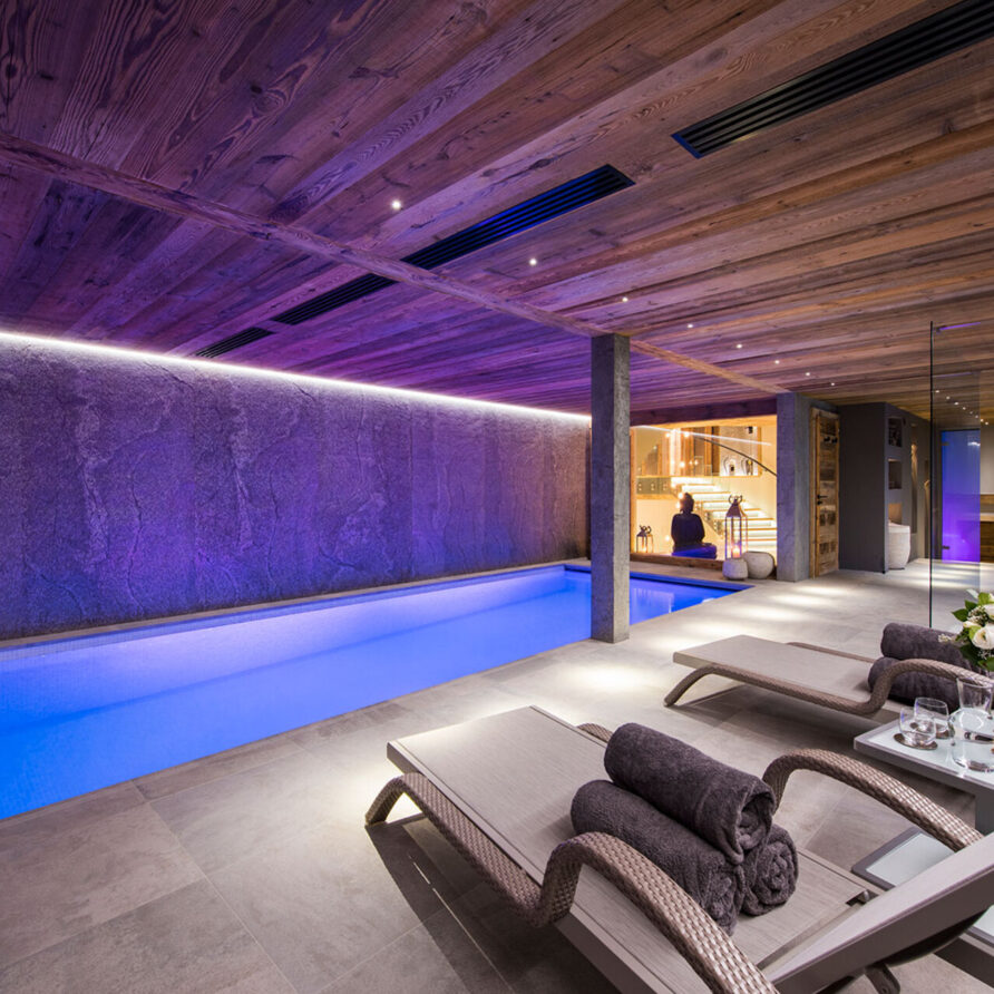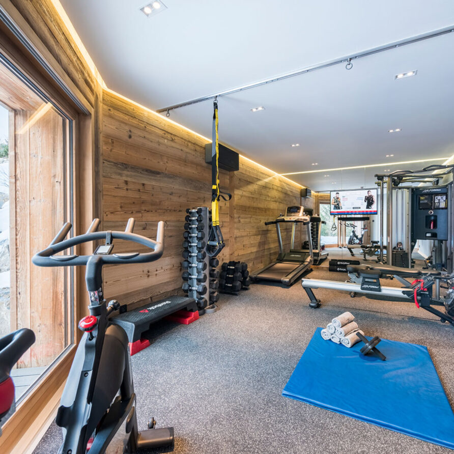 The impressive spa and wellness areas are very spacious for a private chalet. It offers an indoor swimming pool with massage and counter current jets as well as a view of the mountains. There is also a hamman and massage room. Wellness at the chalet isn’t just about relaxation, it is very much seen as a holistic vision which perfectly echoes the modern active lifestyles. Alongside the fantastic spa facilities there is a well equipped gym, and forest trails starting at the foot of the garden.