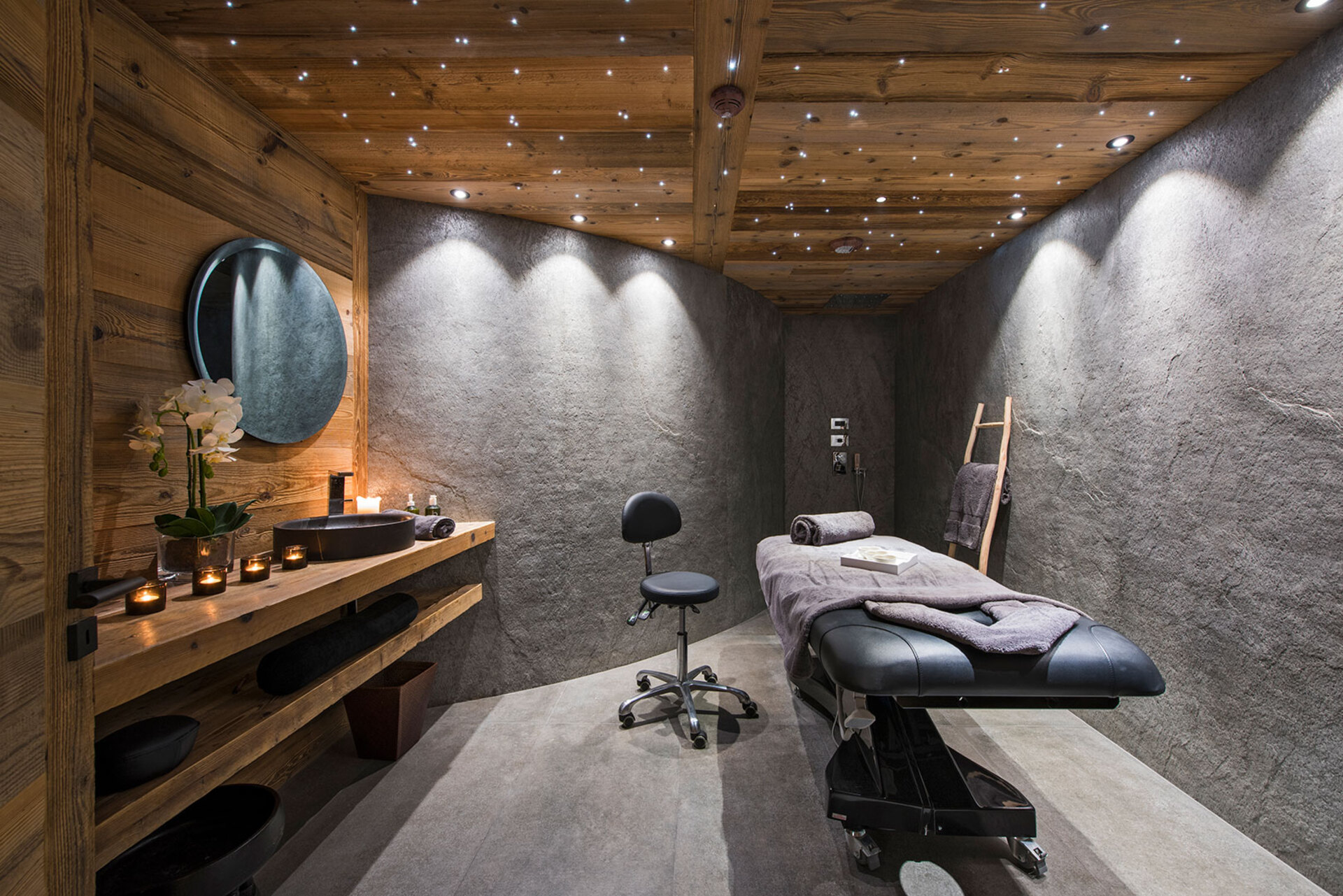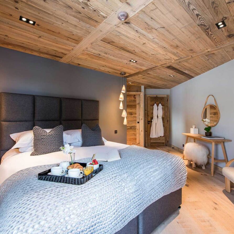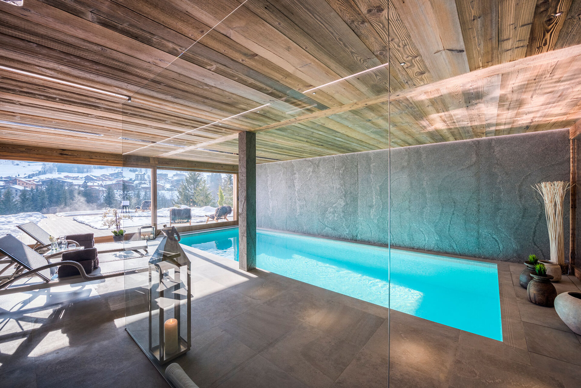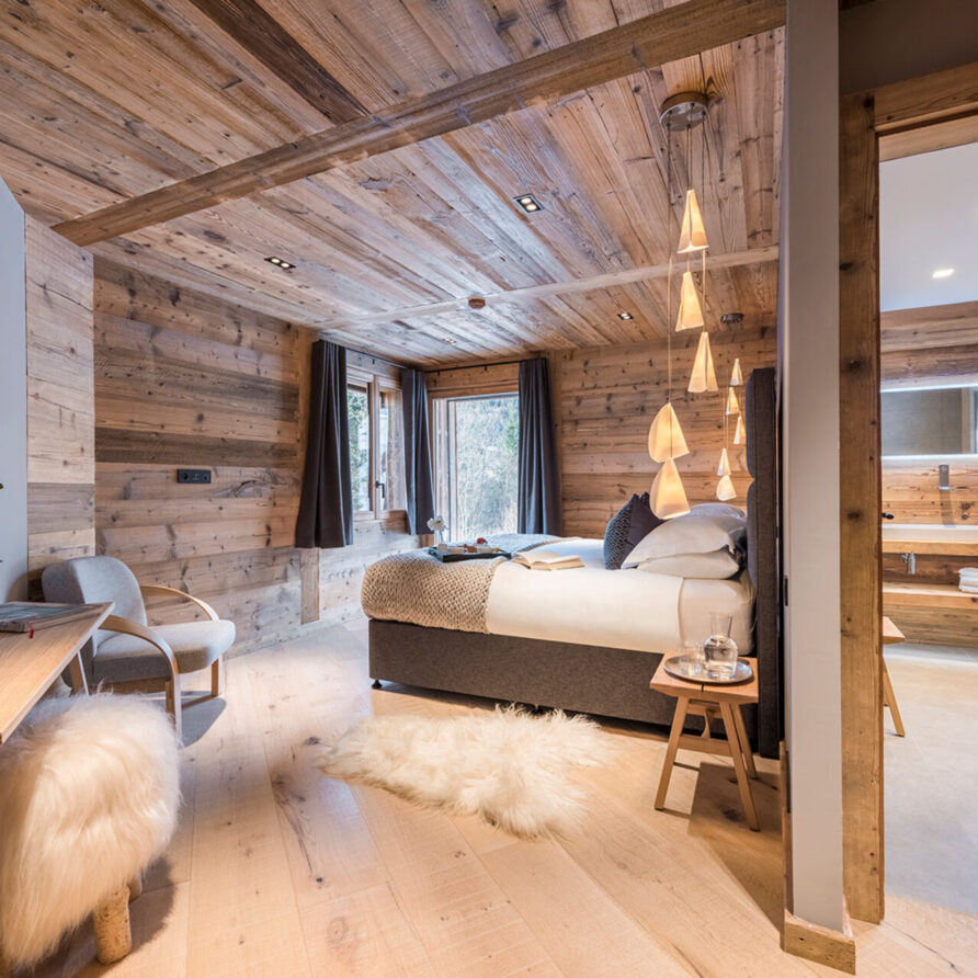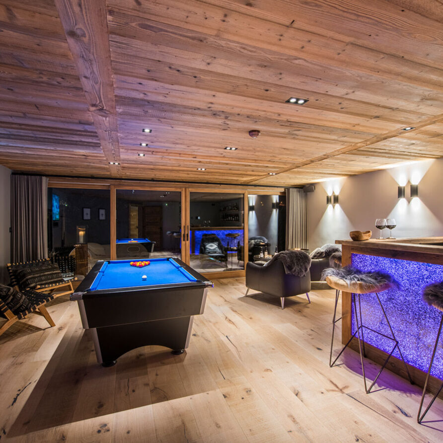 The impressive spa and wellness areas are very spacious for a private chalet. It offers an indoor swimming pool with massage and counter current jets as well as a view of the mountains. There is also a hamman and massage room. Wellness at the chalet isn’t just about relaxation, it is very much seen as a holistic vision which perfectly echoes the modern active lifestyles. Alongside the fantastic spa facilities there is a well equipped gym, and forest trails starting at the foot of the garden.