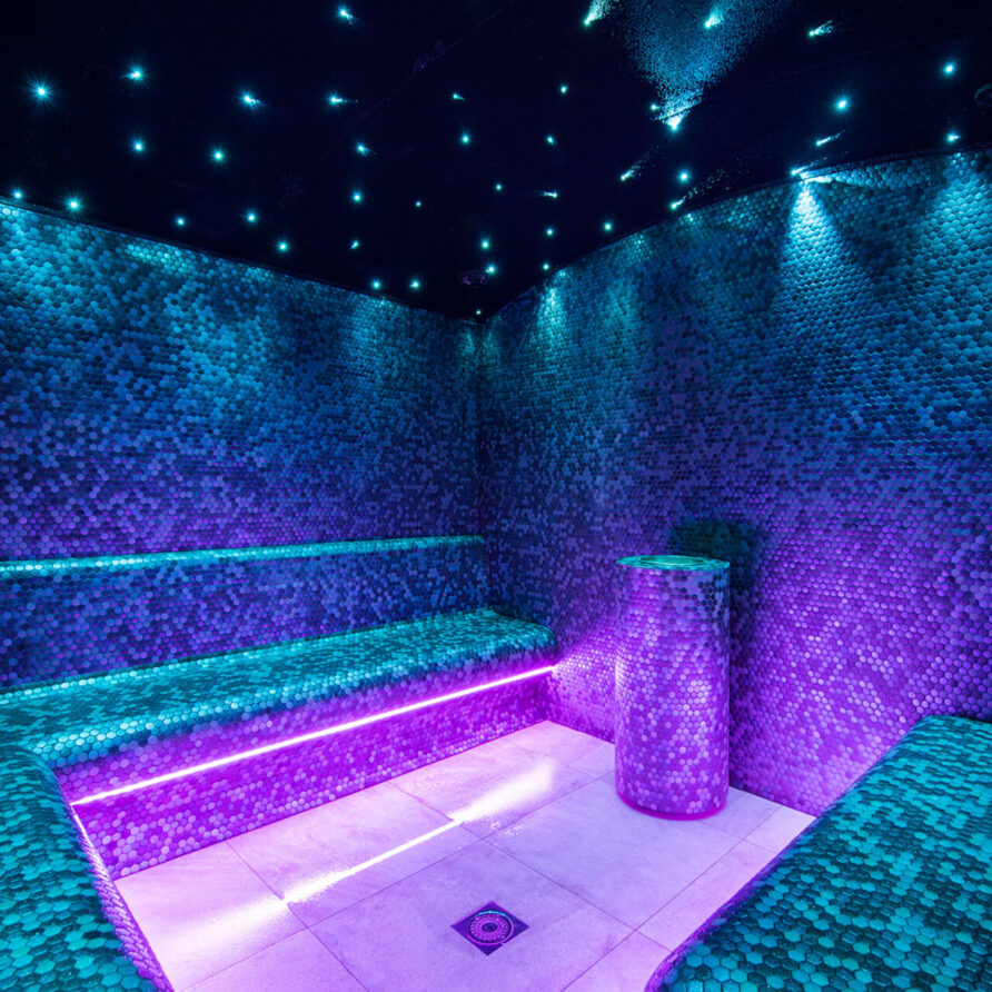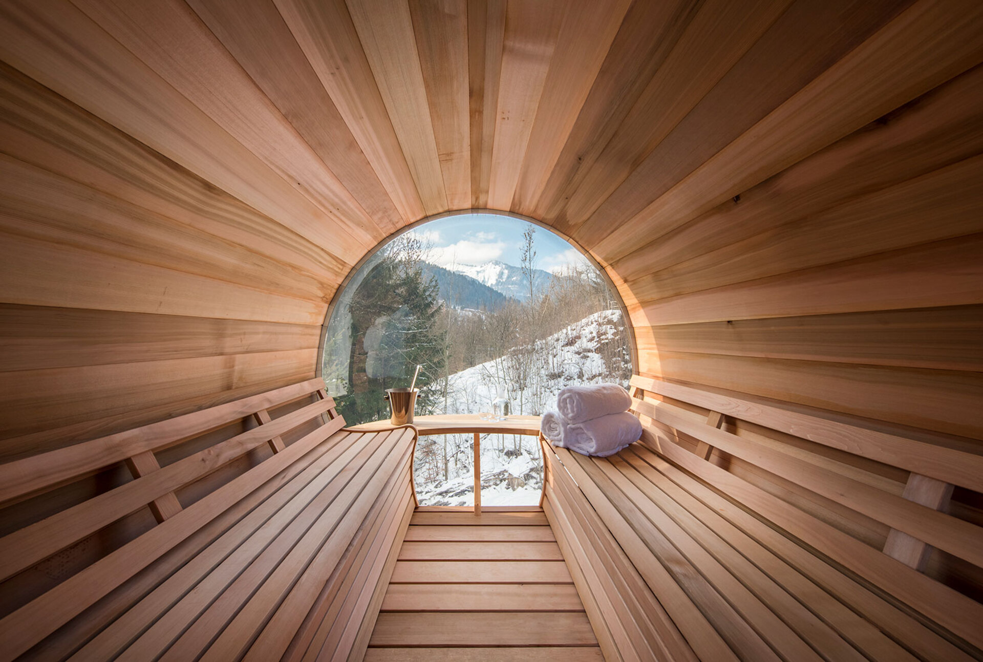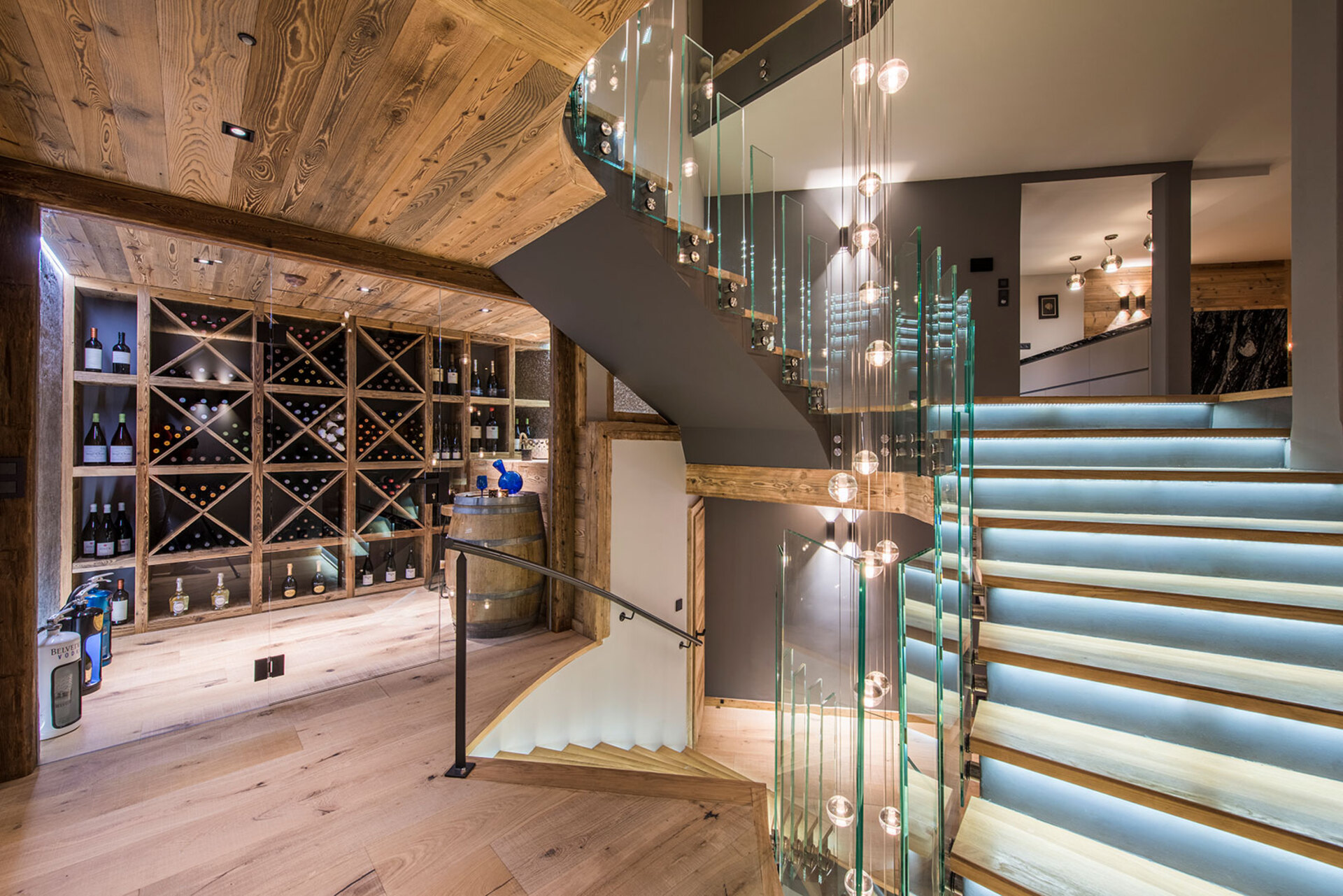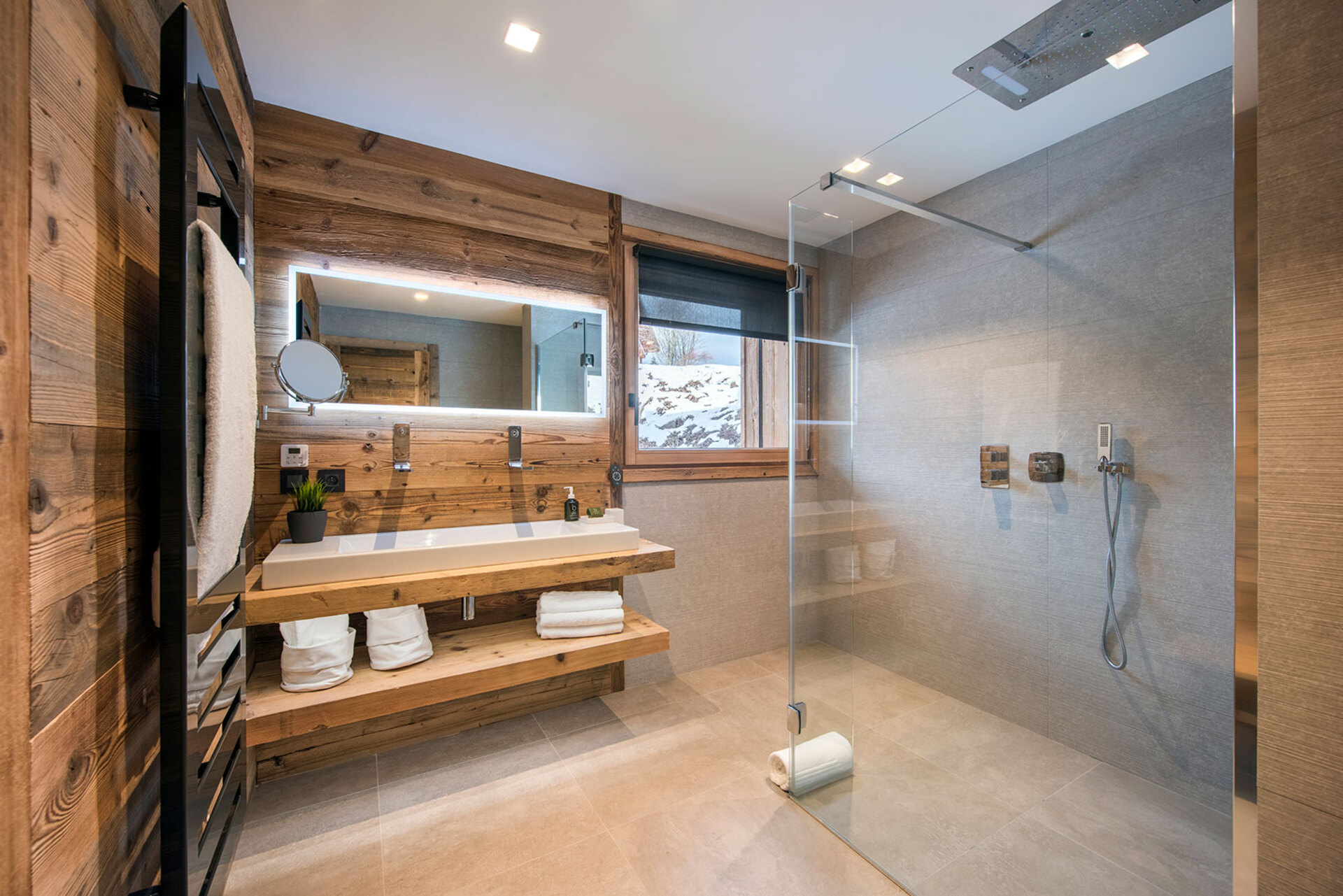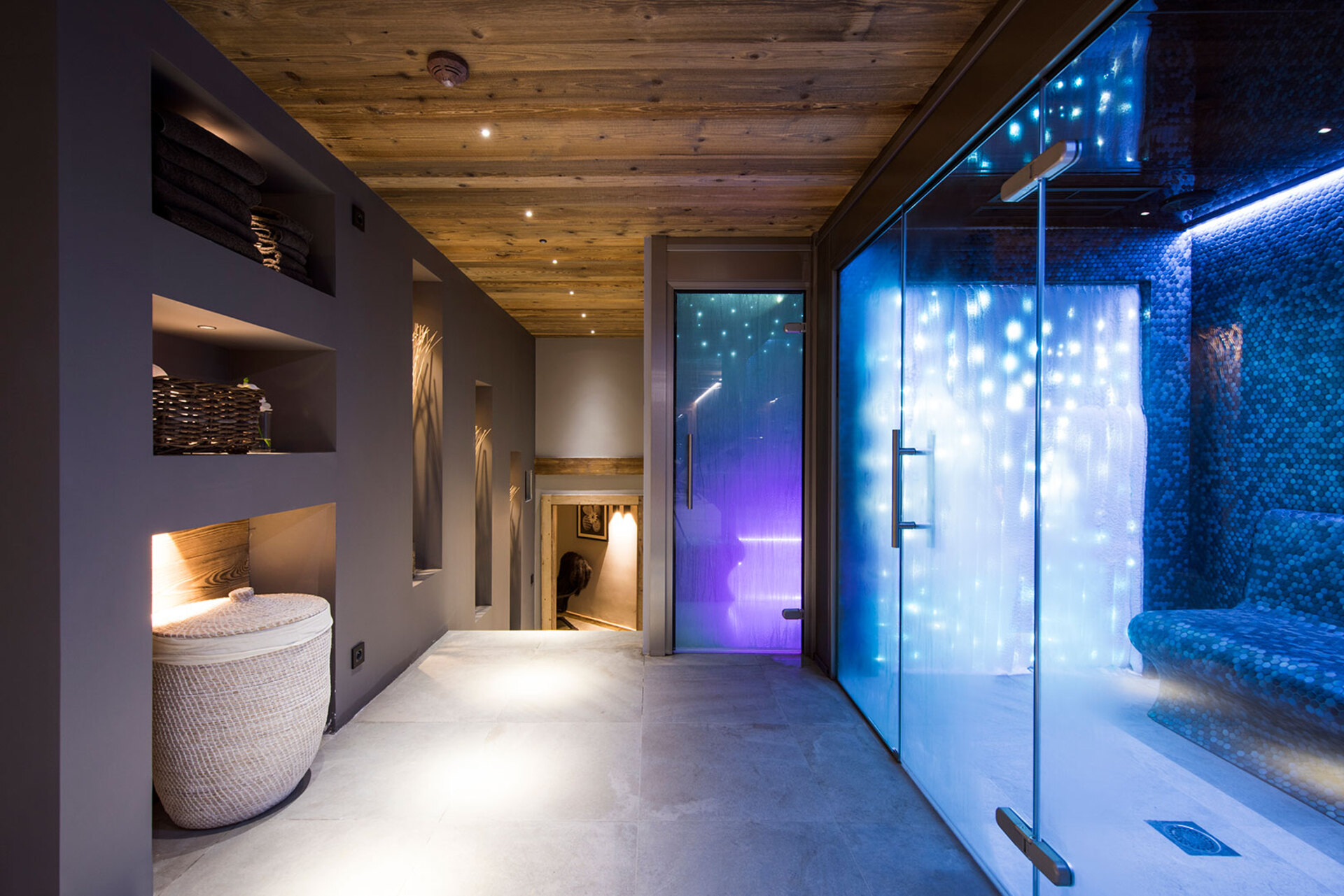 The impressive spa and wellness areas are very spacious for a private chalet. It offers an indoor swimming pool with massage and counter current jets as well as a view of the mountains. There is also a hamman and massage room. Wellness at the chalet isn’t just about relaxation, it is very much seen as a holistic vision which perfectly echoes the modern active lifestyles. Alongside the fantastic spa facilities there is a well equipped gym, and forest trails starting at the foot of the garden.
