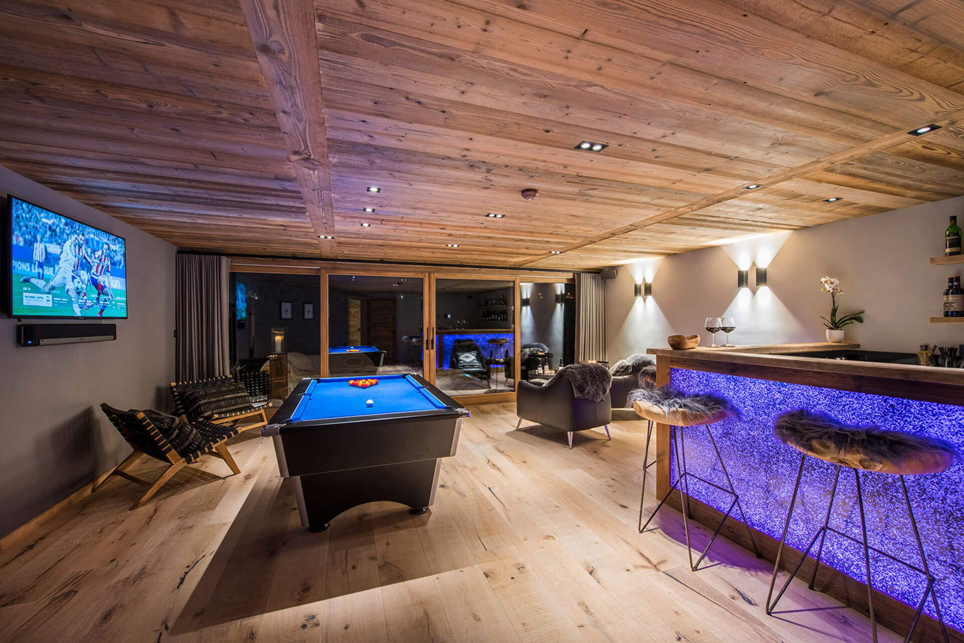 There is bar with pool table and TV, large windows open directly onto the large terrace – a wonderful place to watch the sun set. Watch the latest movies in the cinema room with digital surround. Behind the bar the professional staff prepare speciality cocktails – there are fine wines, craft beers and a range of speciality gins to sample.