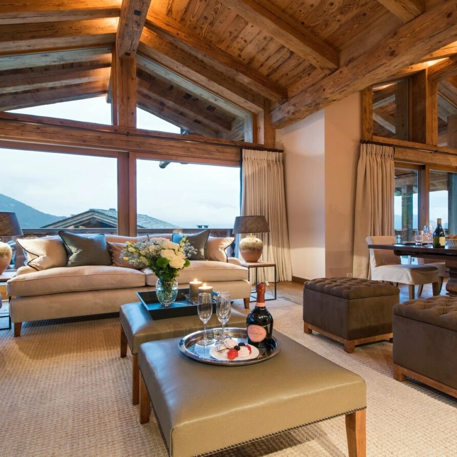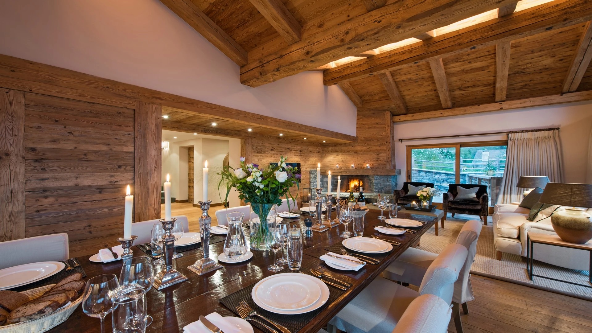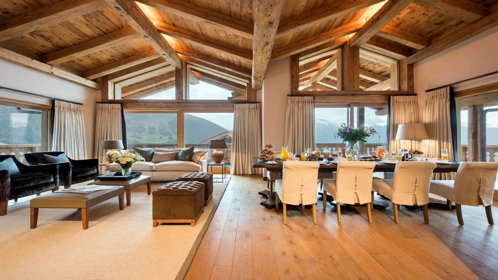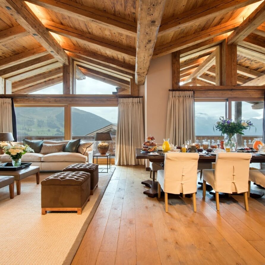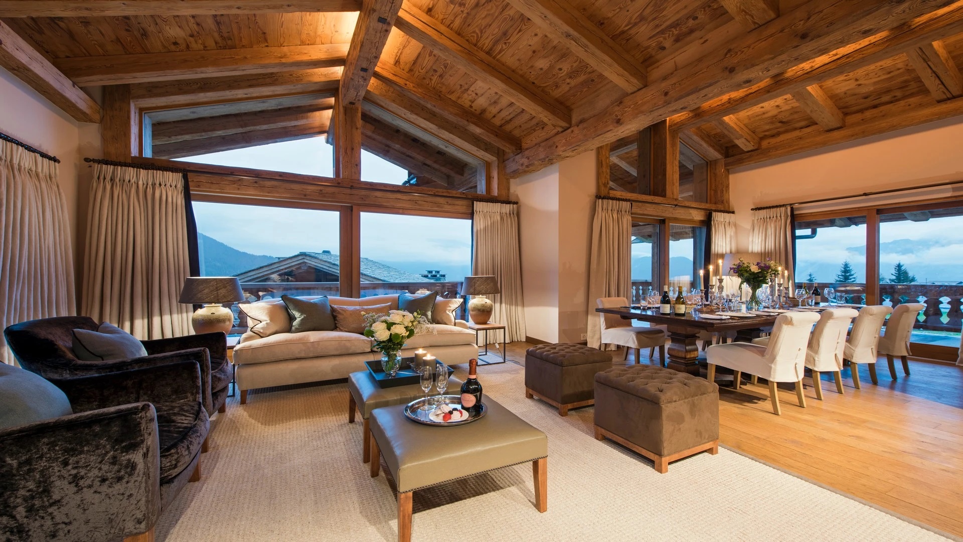 The living area provides direct access to a spacious terrace, creating a seamless blend of indoor and outdoor living. With the terrace acting as a sun-soaked haven, it becomes an ideal location to unwind and indulge in a leisurely sundowner. The terrace not only caters to those seeking a tranquil spot but also offers a picturesque mountain backdrop for social gatherings and entertaining guests. Moreover, the chalet is equipped with the latest sound and entertainment systems, ensuring that every moment is accompanied by cutting-edge audiovisual experiences. The large television in the living area invites you to watch movies or shows after dinner.