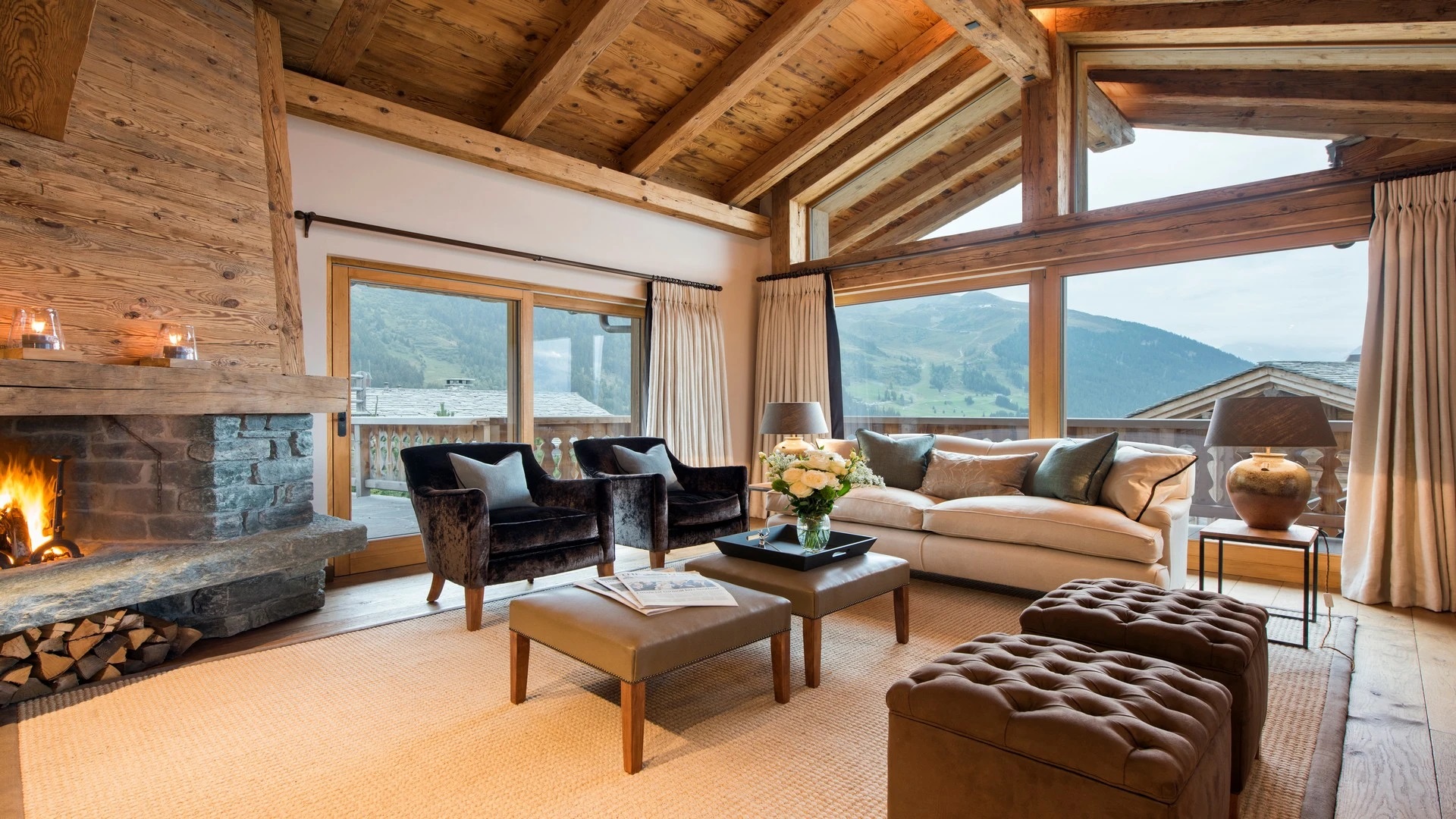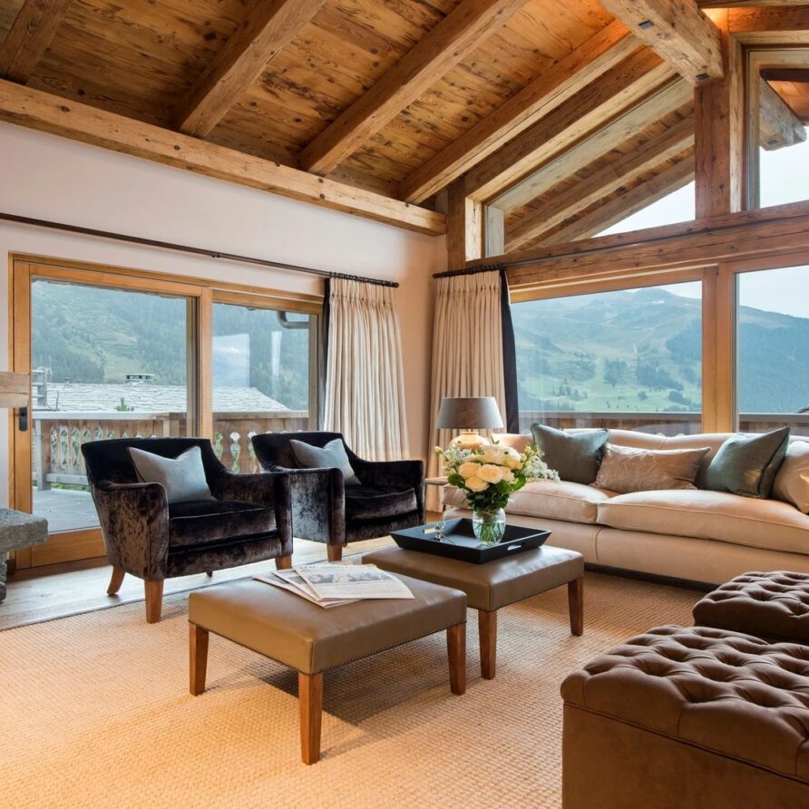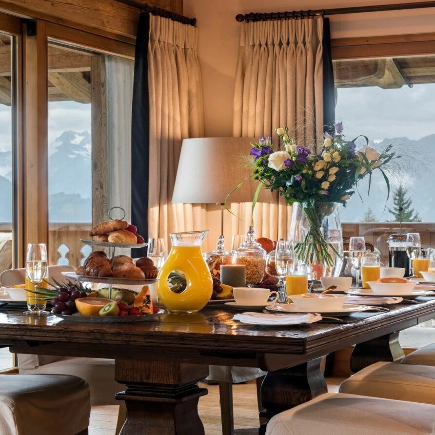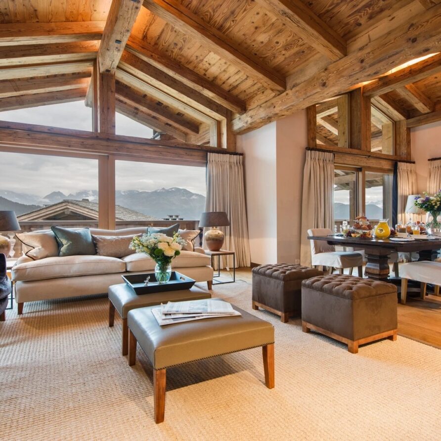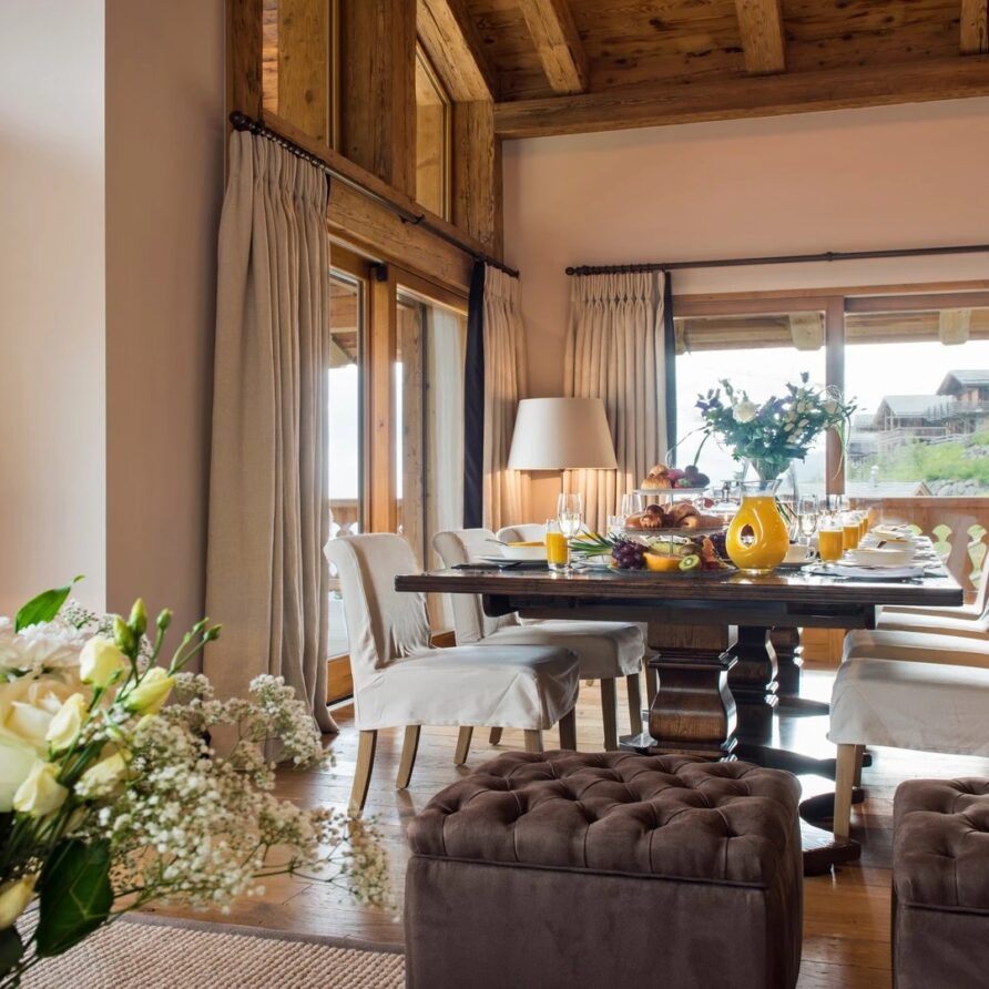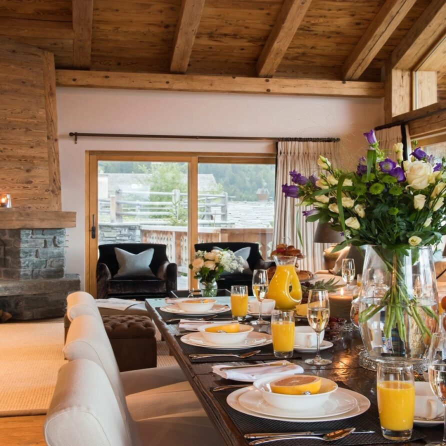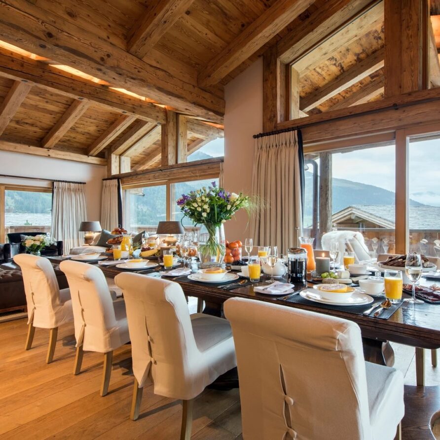 The living area provides direct access to a spacious terrace, creating a seamless blend of indoor and outdoor living. With the terrace acting as a sun-soaked haven, it becomes an ideal location to unwind and indulge in a leisurely sundowner. The terrace not only caters to those seeking a tranquil spot but also offers a picturesque mountain backdrop for social gatherings and entertaining guests. Moreover, the chalet is equipped with the latest sound and entertainment systems, ensuring that every moment is accompanied by cutting-edge audiovisual experiences. The large television in the living area invites you to watch movies or shows after dinner.