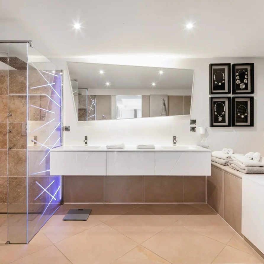 A heaven of style and tranquillity, the exteriors are stylishly finished with a cutting-edge type of architecture. A contemporary style floods the interior, with small Cypriot accents. With a side set of sliding doors and tall windows, the interiors feel warm and ambient from the seeping natural daylight. The kitchen is state of the art, with a sleek design and the latest appliances overlooking a long dining table. This spacious villa can accommodate up to 14 people, with 7 beautiful bedrooms with en-suite bathrooms and living areas located on both floors, making the property very suitable for two families or similar combinations.