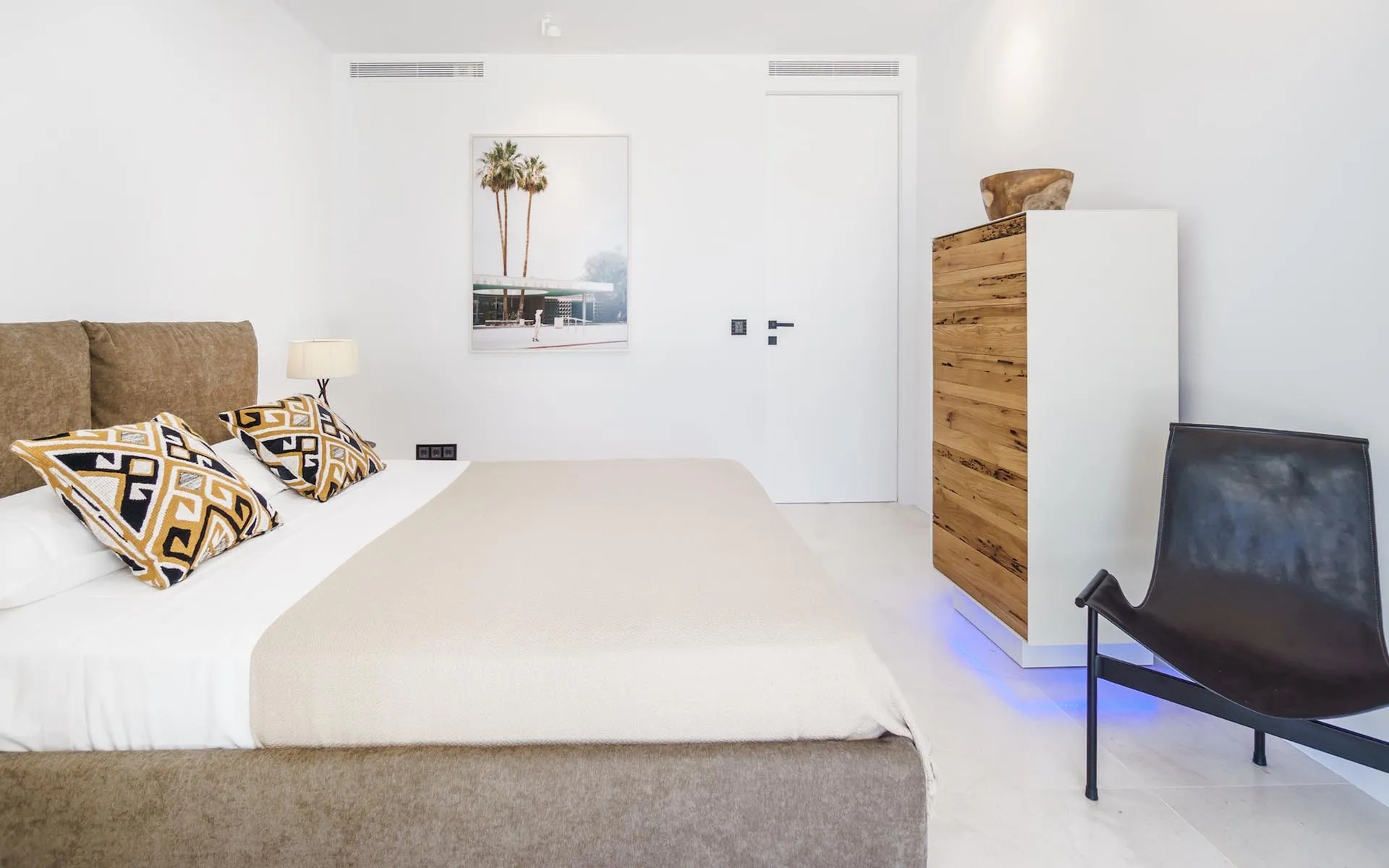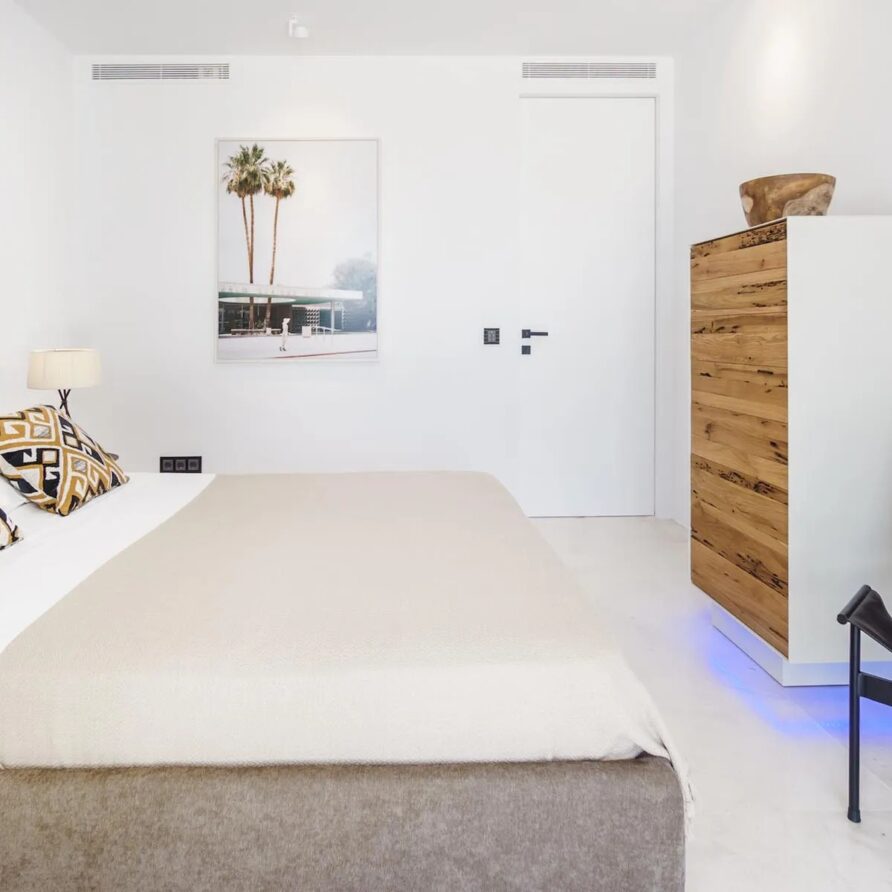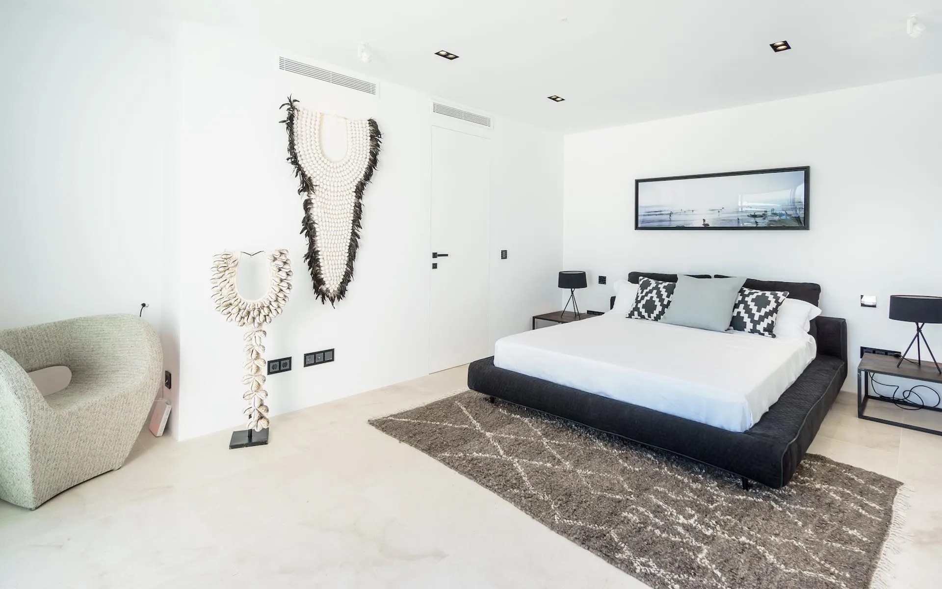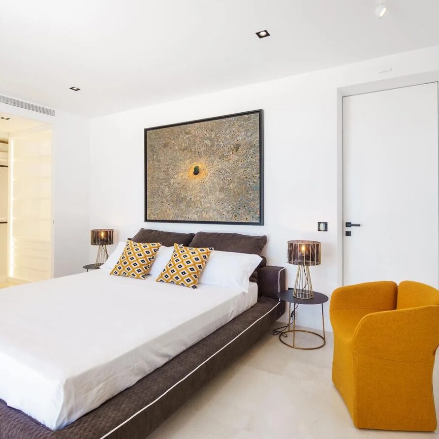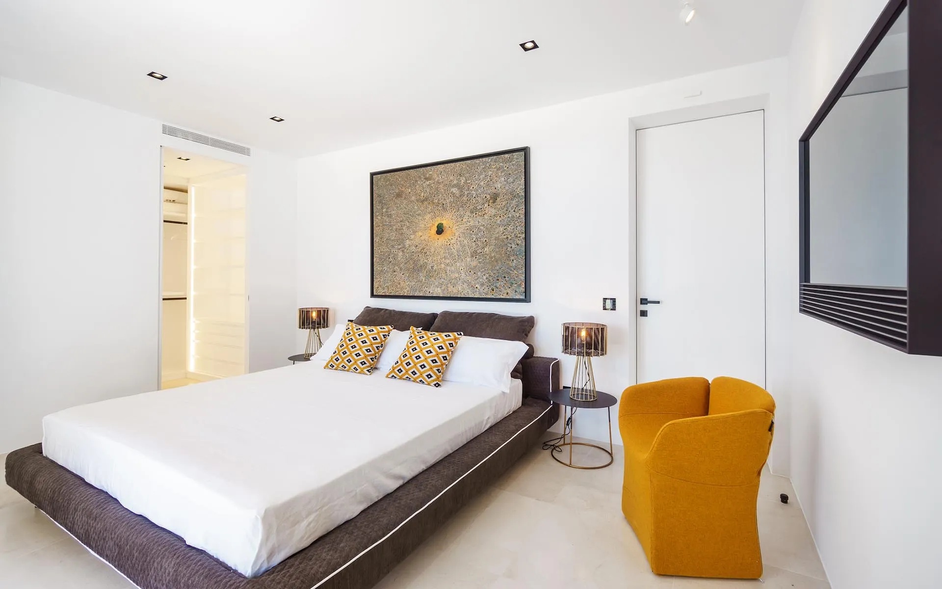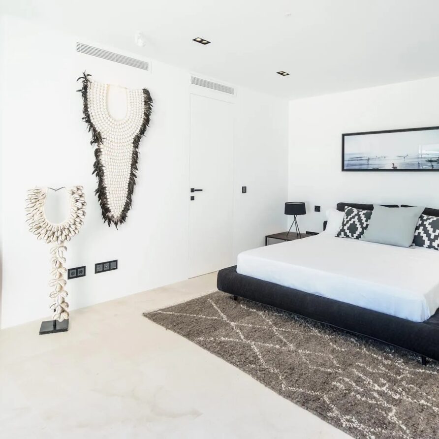 Inside, Luxury Villa Ibiza with Pool has been designed to let the outside world in. Floor to ceiling windows let the magnificent Mediterranean Sea view in whilst flooding the stylish interior with sweet summer sunshine. Design is everything here. Open plan living spaces flow from one to another making this home the ultimate summer retreat for those wanting a get together in smooth sophistication. Elegant furnishings and suave artwork create a feeling of grandeur whilst modern touches bring the piece right up to date. Couple that with a high tech Bang & Olufsen system throughout the interior and in several zones outside and you’ve found your zen right here.