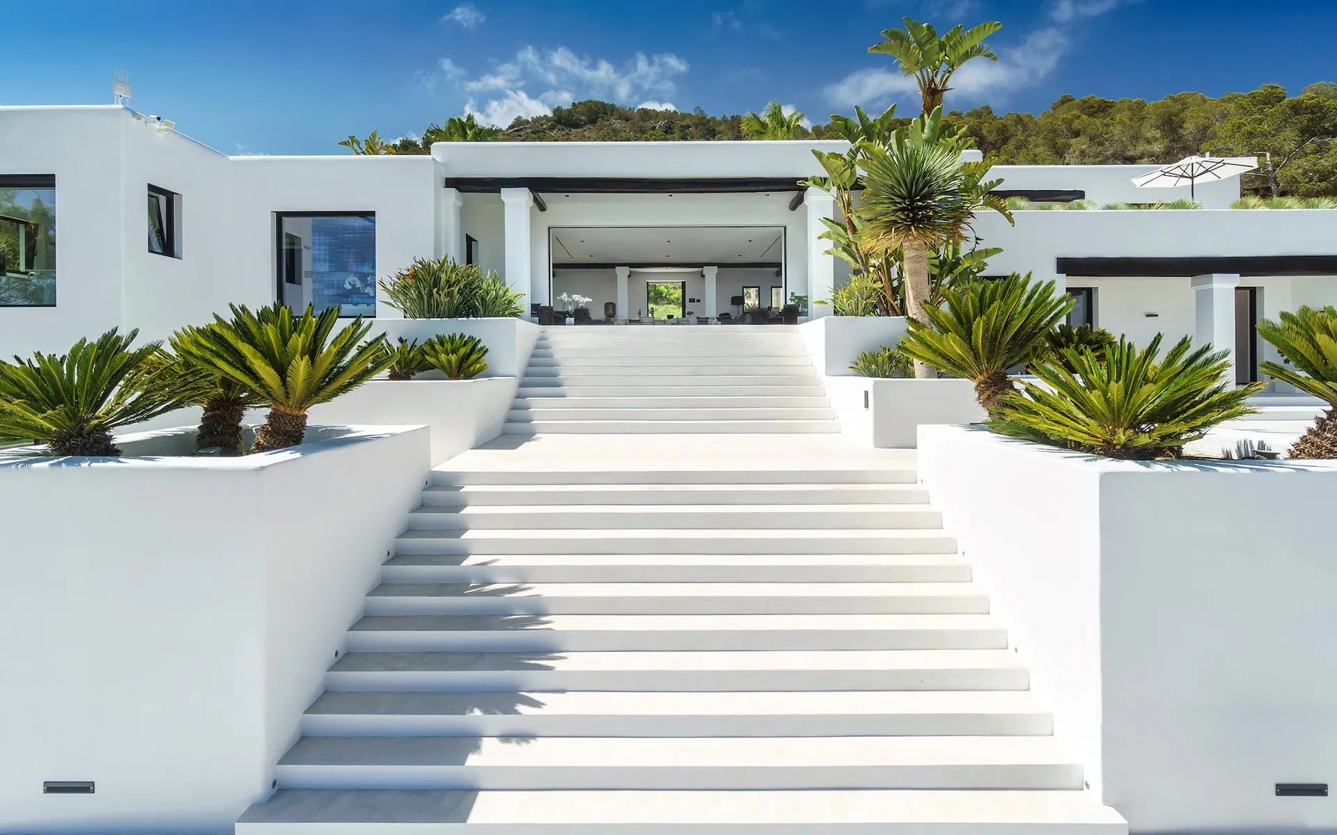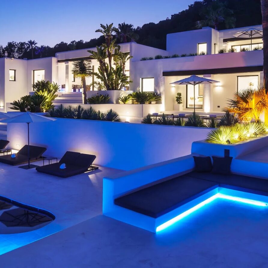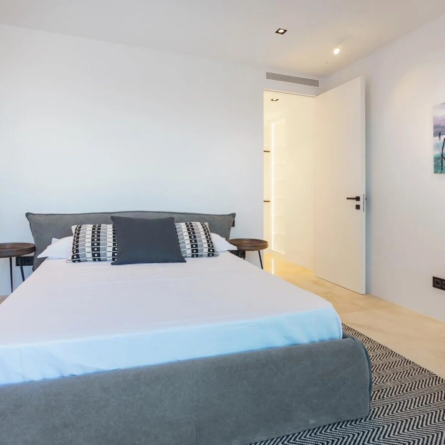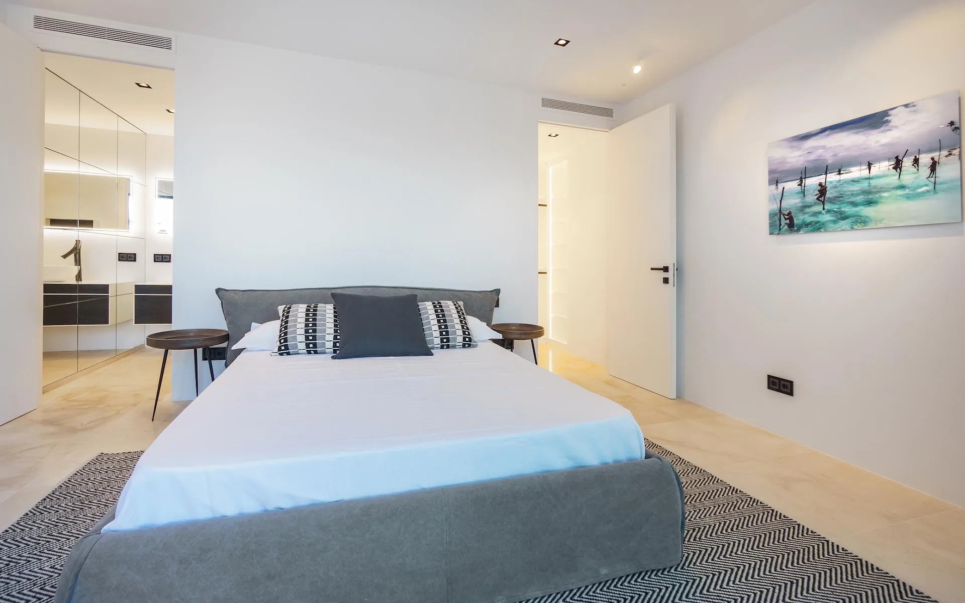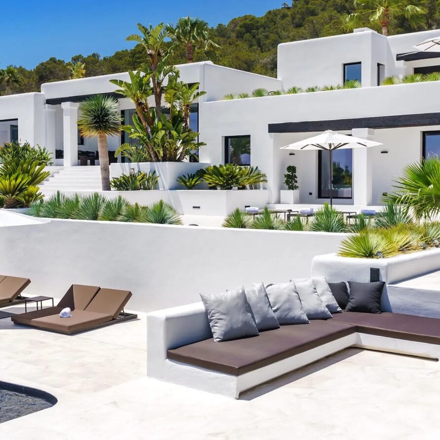 Inside, Luxury Villa Ibiza with Pool has been designed to let the outside world in. Floor to ceiling windows let the magnificent Mediterranean Sea view in whilst flooding the stylish interior with sweet summer sunshine. Design is everything here. Open plan living spaces flow from one to another making this home the ultimate summer retreat for those wanting a get together in smooth sophistication. Elegant furnishings and suave artwork create a feeling of grandeur whilst modern touches bring the piece right up to date. Couple that with a high tech Bang & Olufsen system throughout the interior and in several zones outside and you’ve found your zen right here.