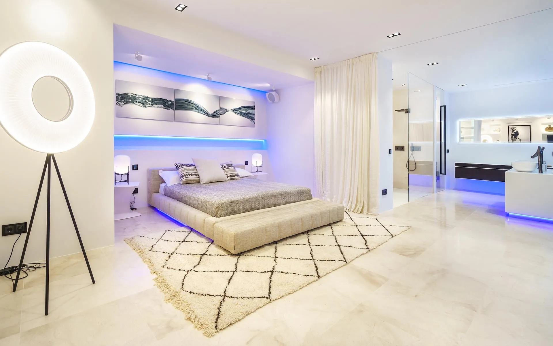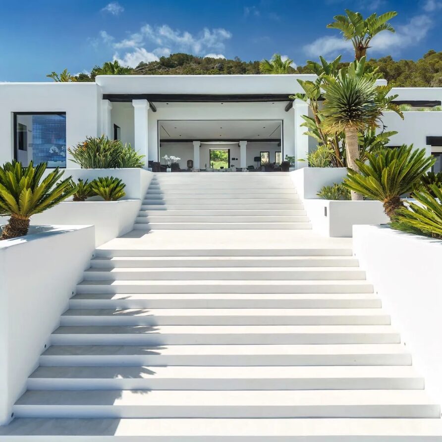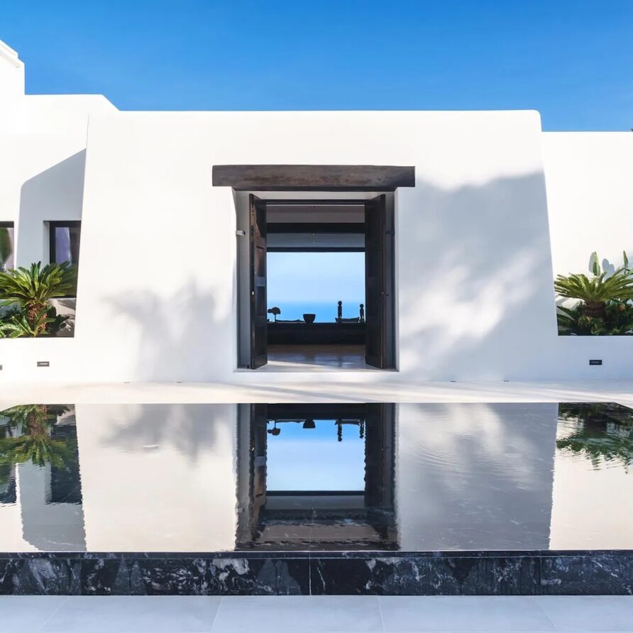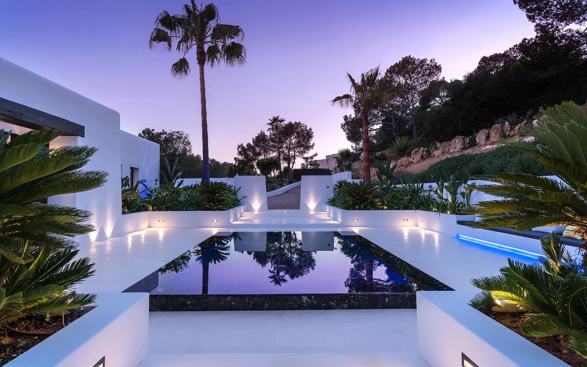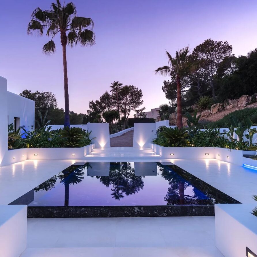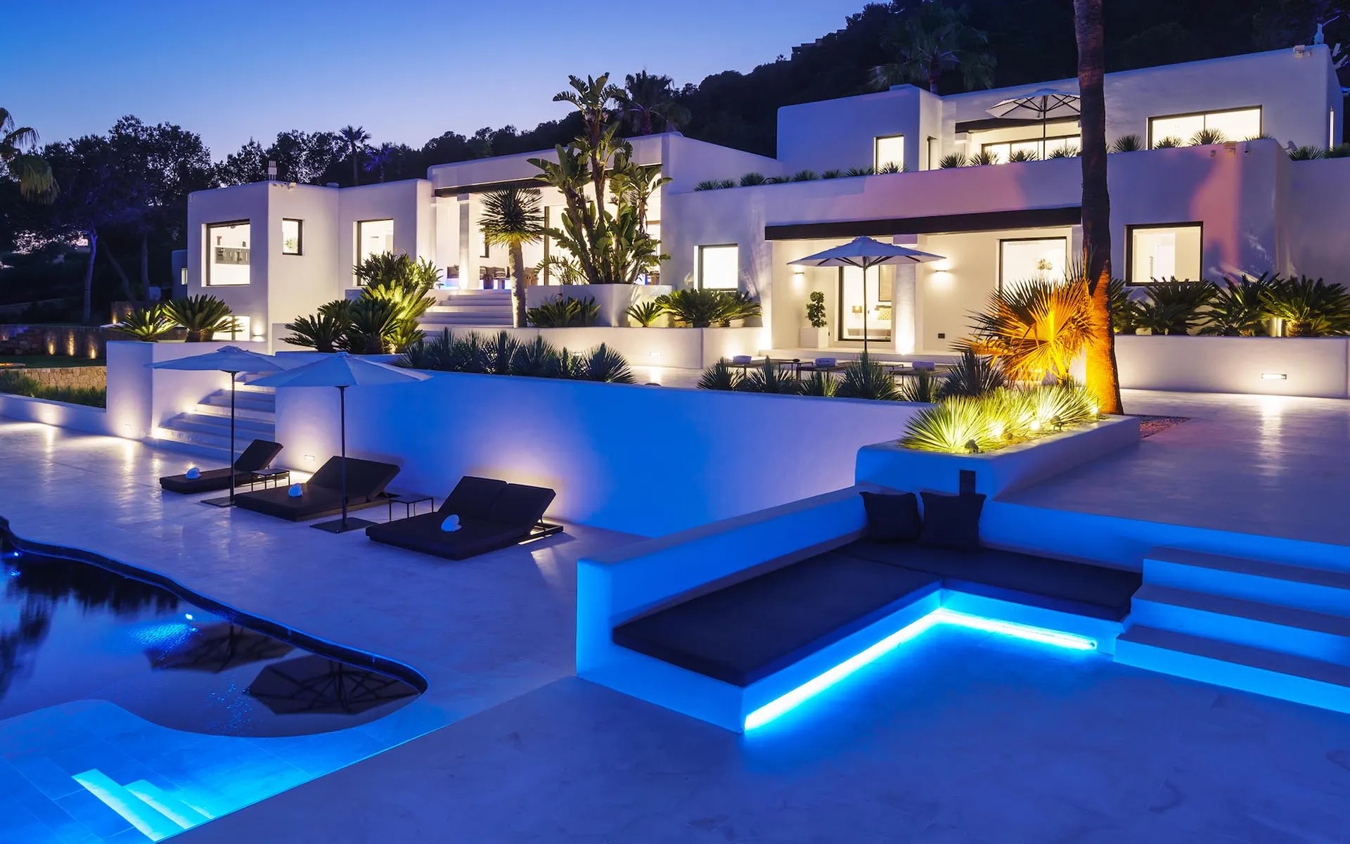 Inside, Luxury Villa Ibiza with Pool has been designed to let the outside world in. Floor to ceiling windows let the magnificent Mediterranean Sea view in whilst flooding the stylish interior with sweet summer sunshine. Design is everything here. Open plan living spaces flow from one to another making this home the ultimate summer retreat for those wanting a get together in smooth sophistication. Elegant furnishings and suave artwork create a feeling of grandeur whilst modern touches bring the piece right up to date. Couple that with a high tech Bang & Olufsen system throughout the interior and in several zones outside and you’ve found your zen right here.