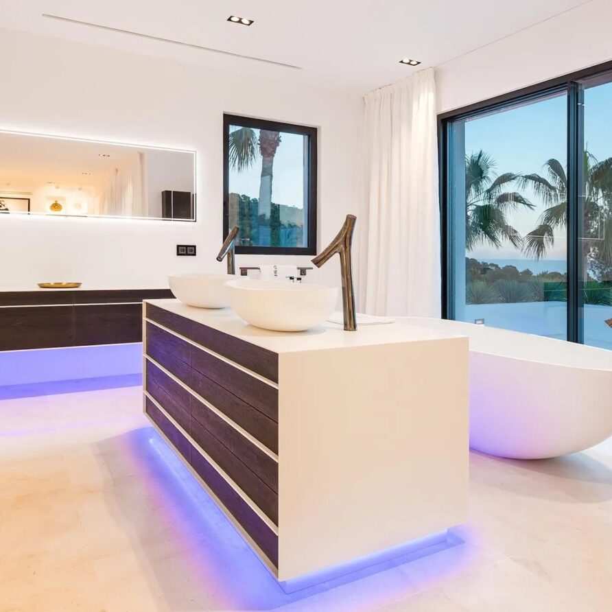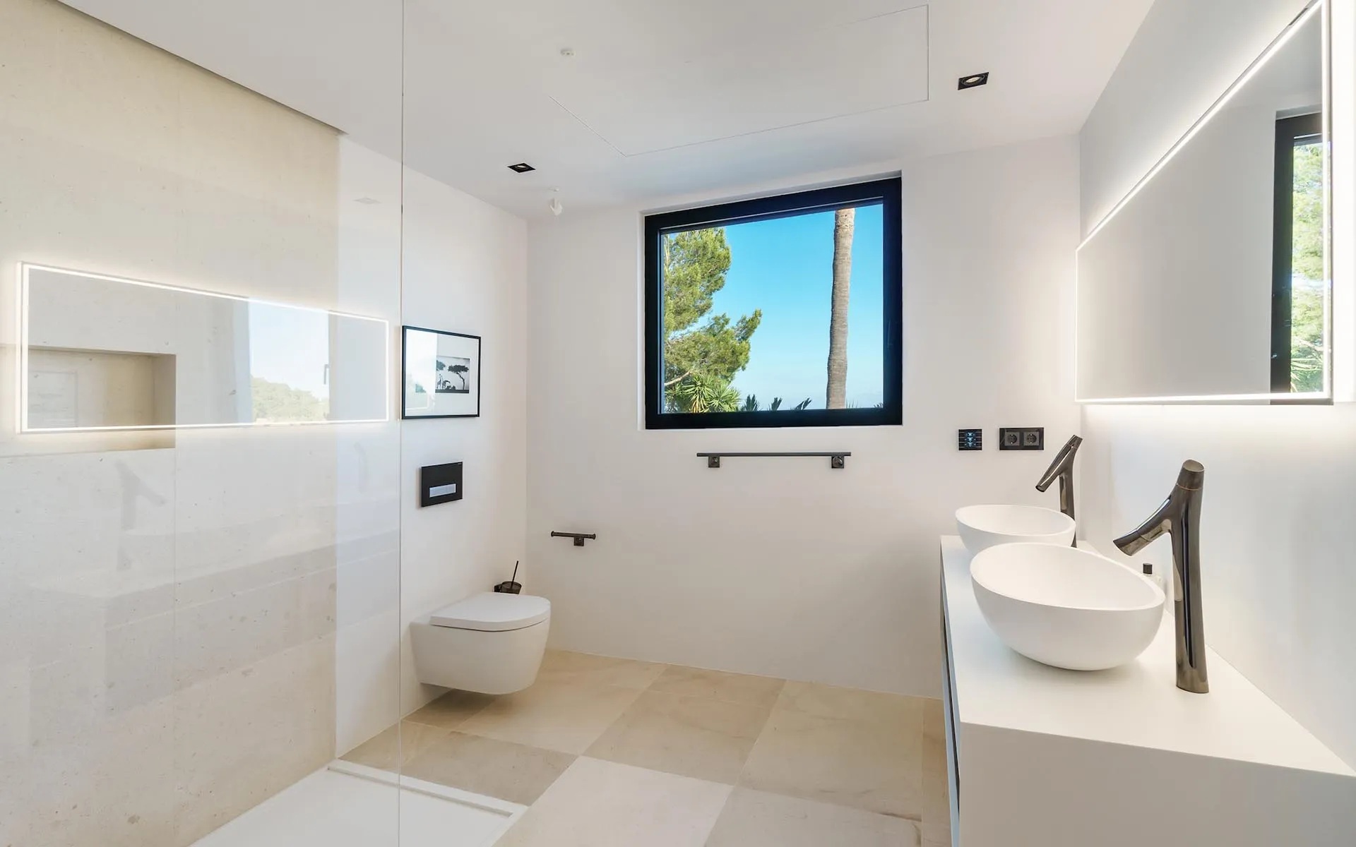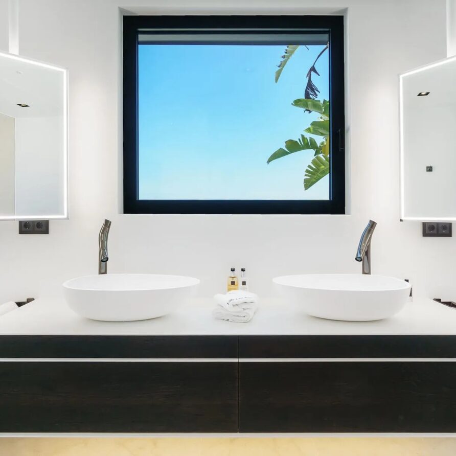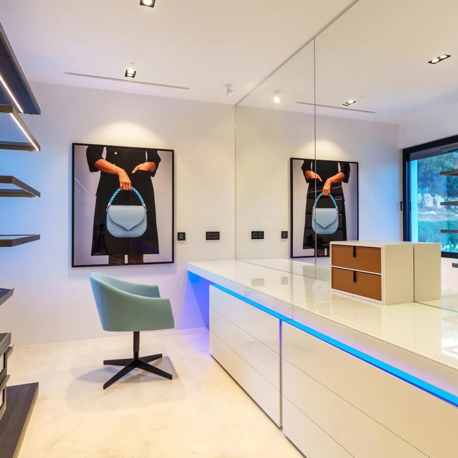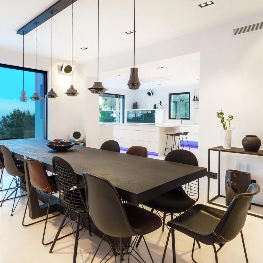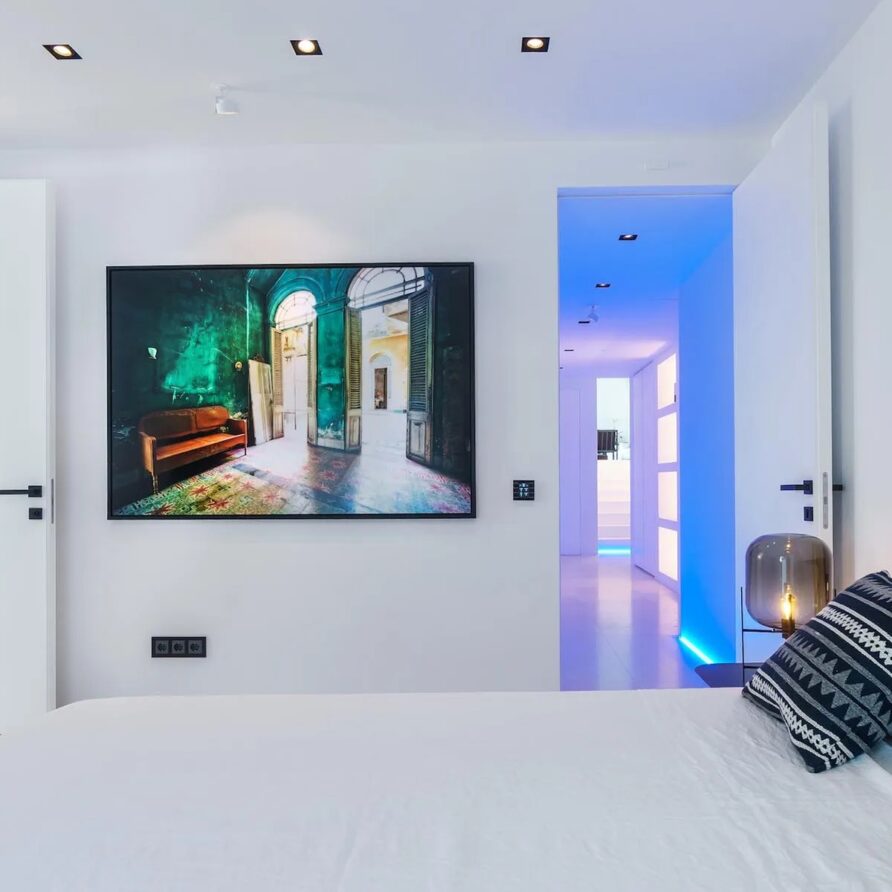 Inside, Luxury Villa Ibiza with Pool has been designed to let the outside world in. Floor to ceiling windows let the magnificent Mediterranean Sea view in whilst flooding the stylish interior with sweet summer sunshine. Design is everything here. Open plan living spaces flow from one to another making this home the ultimate summer retreat for those wanting a get together in smooth sophistication. Elegant furnishings and suave artwork create a feeling of grandeur whilst modern touches bring the piece right up to date. Couple that with a high tech Bang & Olufsen system throughout the interior and in several zones outside and you’ve found your zen right here.