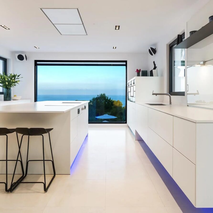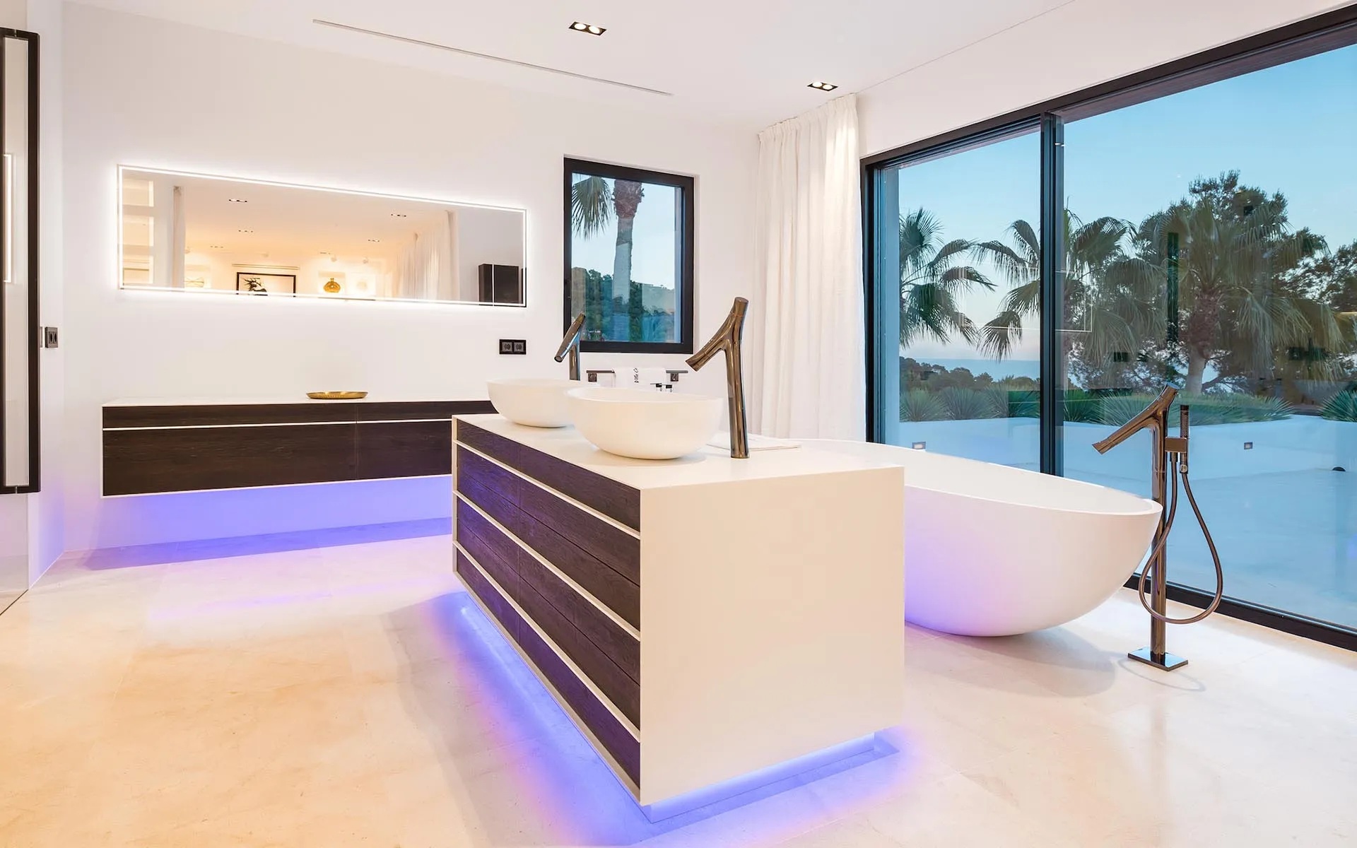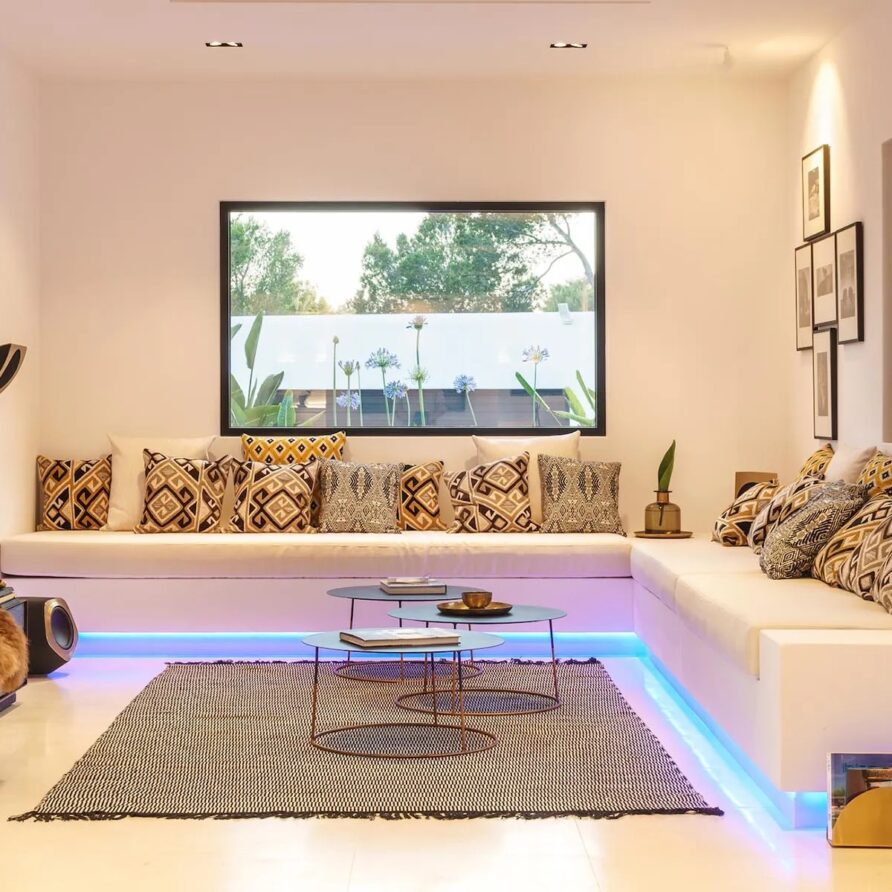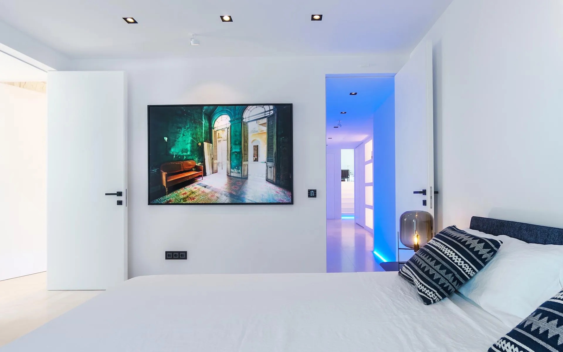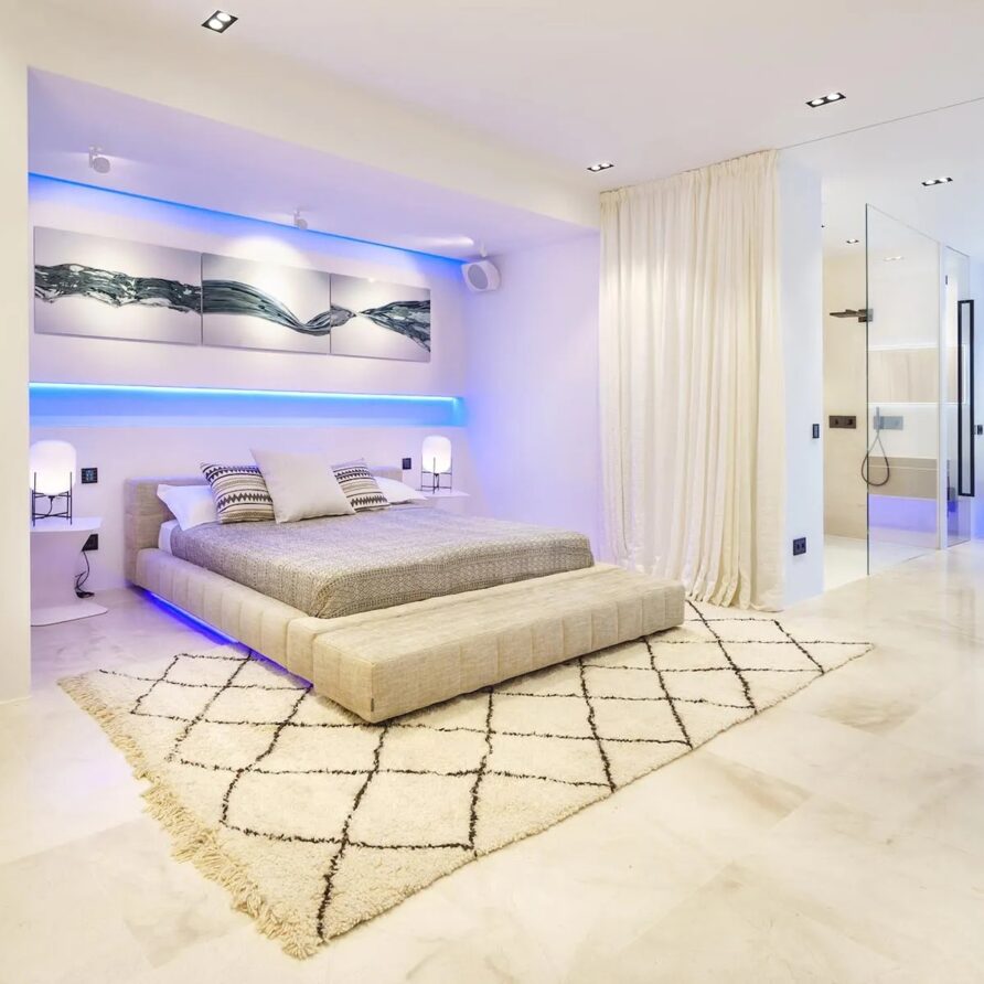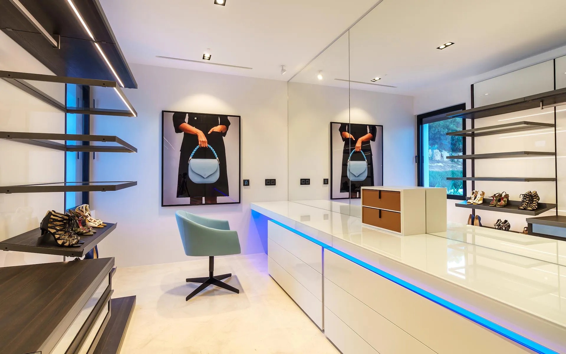 Inside, Luxury Villa Ibiza with Pool has been designed to let the outside world in. Floor to ceiling windows let the magnificent Mediterranean Sea view in whilst flooding the stylish interior with sweet summer sunshine. Design is everything here. Open plan living spaces flow from one to another making this home the ultimate summer retreat for those wanting a get together in smooth sophistication. Elegant furnishings and suave artwork create a feeling of grandeur whilst modern touches bring the piece right up to date. Couple that with a high tech Bang & Olufsen system throughout the interior and in several zones outside and you’ve found your zen right here.