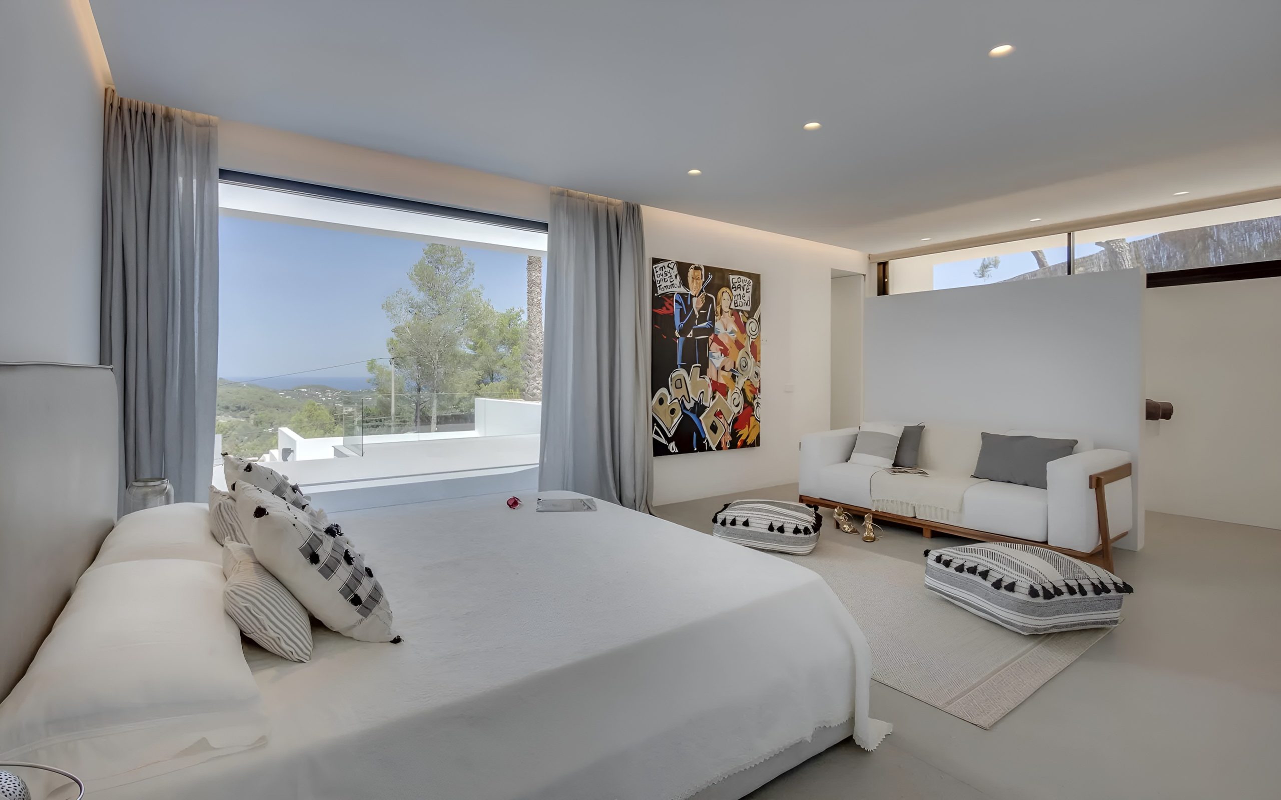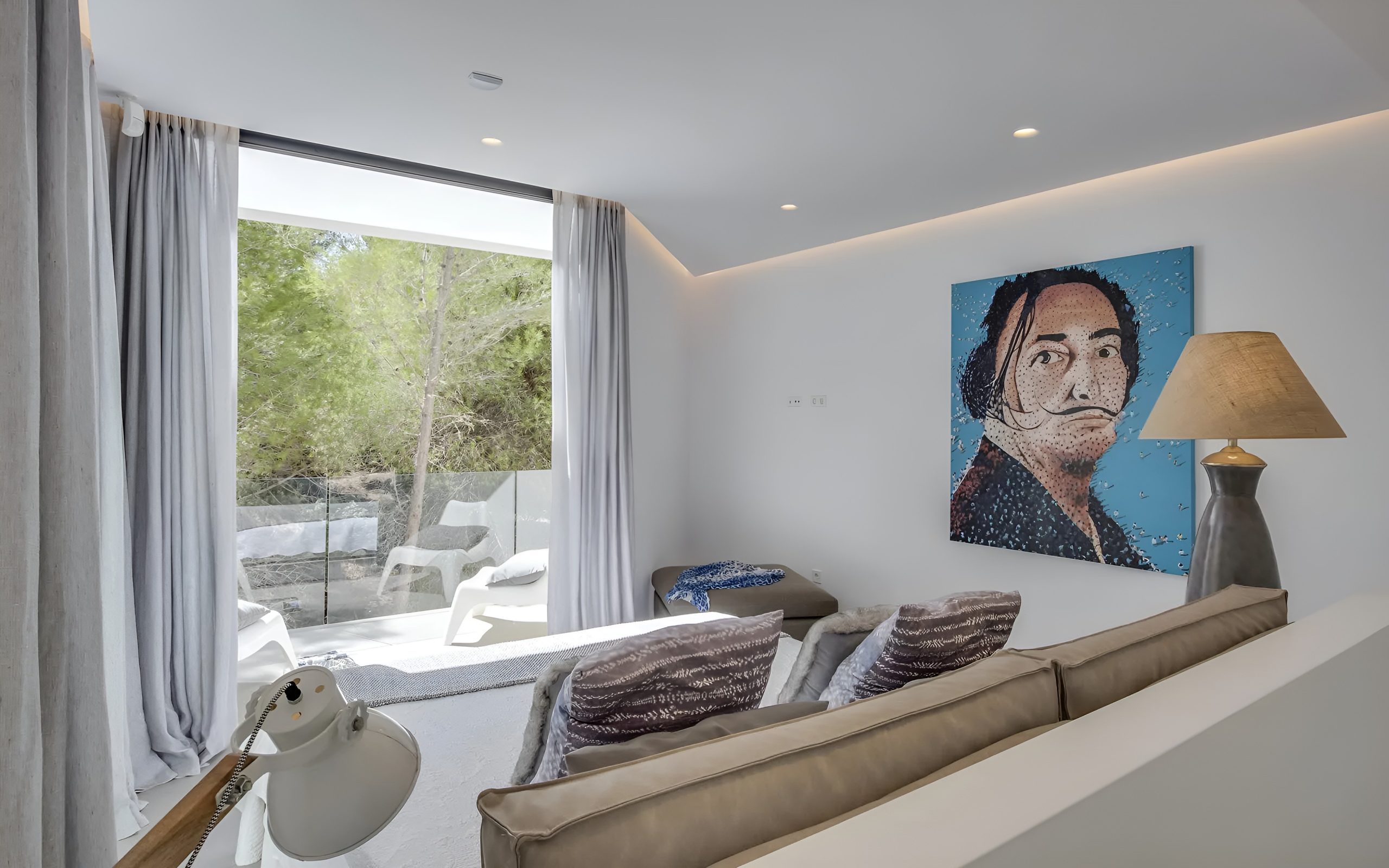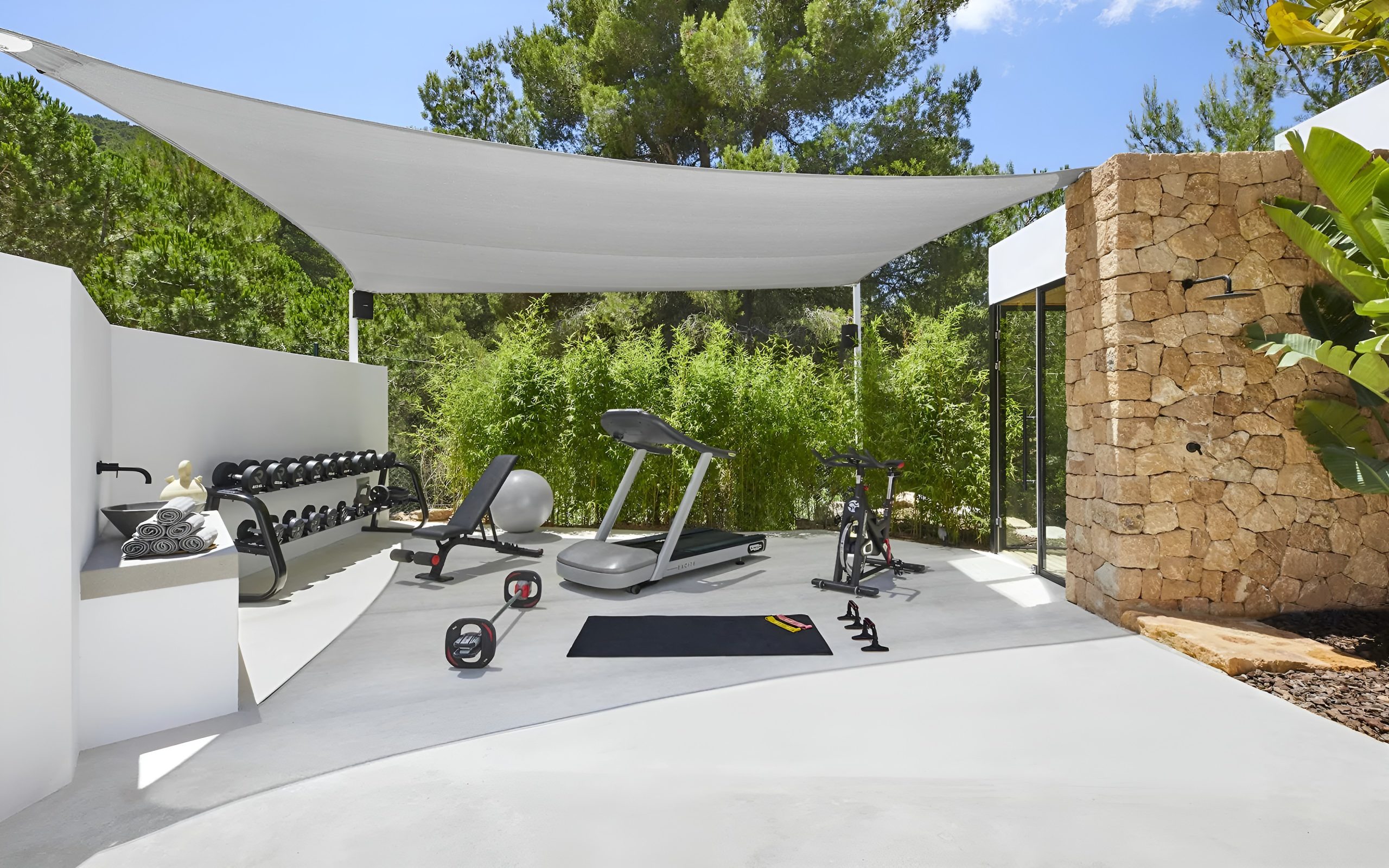It’s the simple things that transform minimalism into a masterpiece. Creating a white box in a pine forest is one thing; having the grounds cascade down the hill incorporating a gorgeous lap swimming pool, luxurious loungers, pampering palms and impeccable stone masonry and you have, quite simply, a work of art. Not one but two outdoor lounges sit on the grand outdoor terraces, one shaded by the modern cabana and at certain points on the clock, the other by the natural shade of the pine forest. Tucked away in a corner you will find the outdoor gym and shower, so you never have to pull yourself away from the Ibizan sunshine during your workout.