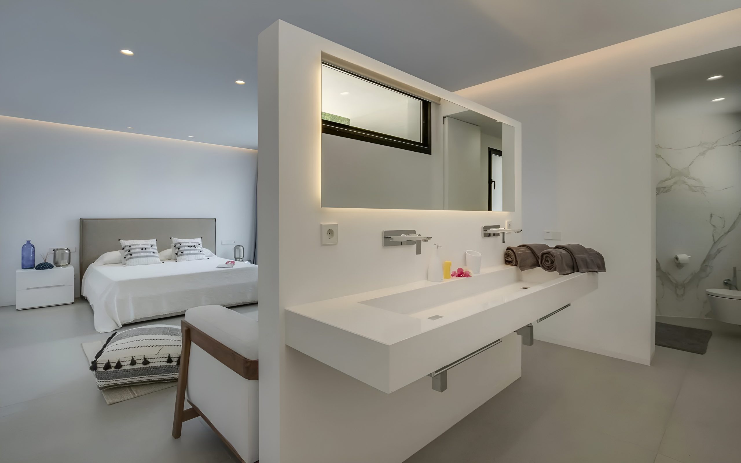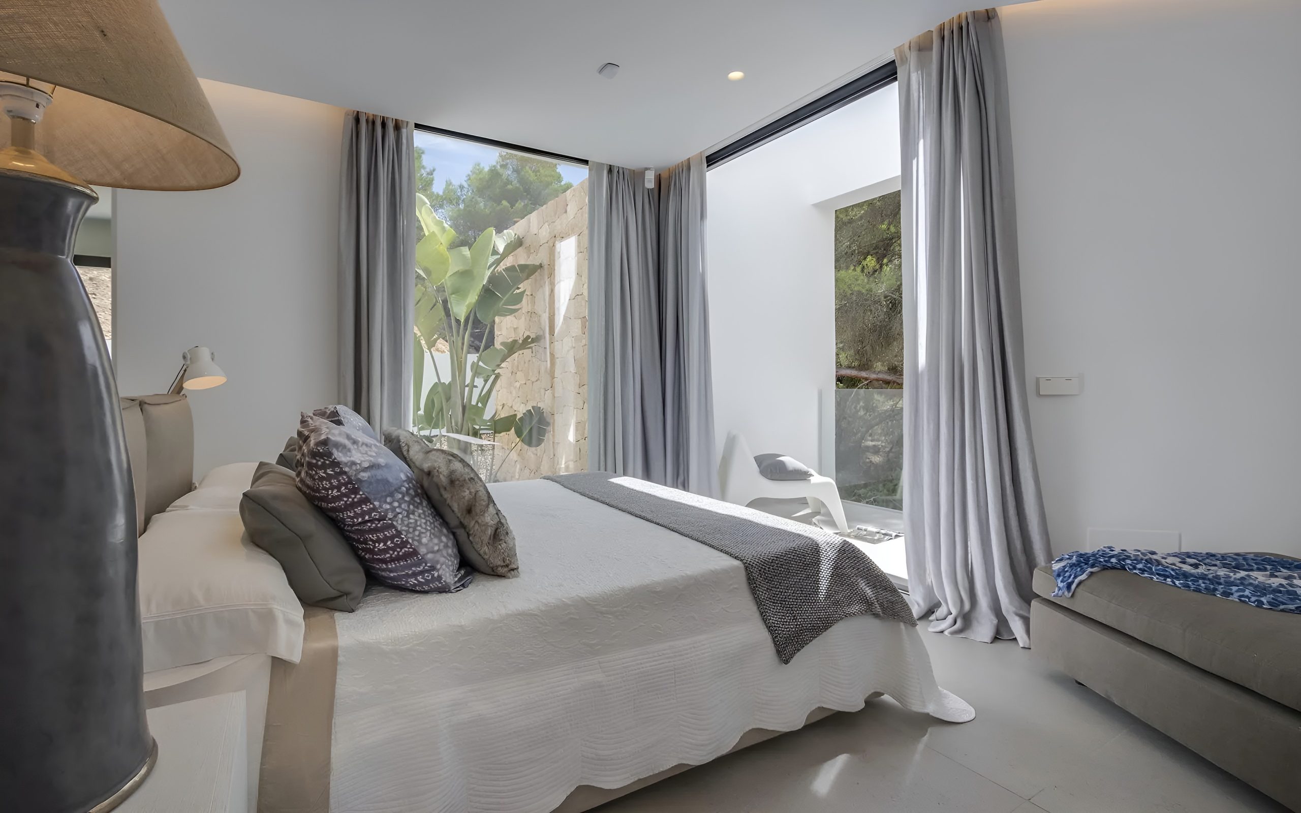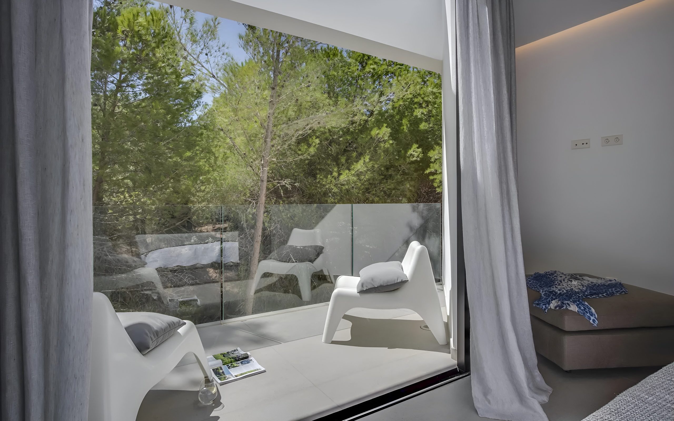 It’s the simple things that transform minimalism into a masterpiece. Creating a white box in a pine forest is one thing; having the grounds cascade down the hill incorporating a gorgeous lap swimming pool, luxurious loungers, pampering palms and impeccable stone masonry and you have, quite simply, a work of art. Not one but two outdoor lounges sit on the grand outdoor terraces, one shaded by the modern cabana and at certain points on the clock, the other by the natural shade of the pine forest. Tucked away in a corner you will find the outdoor gym and shower, so you never have to pull yourself away from the Ibizan sunshine during your workout.